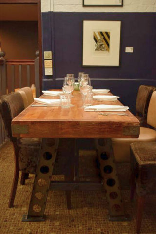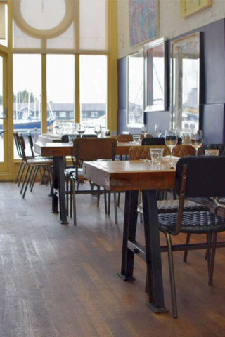 Bistro On The Quay utilised our bespoke products to create a distinctive look with the Butcher’s Block Dining Table paired with the A-Frame Industrial Base. An effortless statement is made with the contrasting pine that wraps around the oak centre and metal accents to the table corners. This table compliments the wooden accents already present within the restaurant and enhances the character of Bistro On The Quay adding to the industrial and coastal themes.