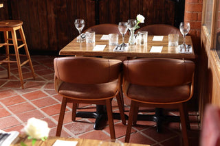 Around the structural, brick pillars of the barn, we introduced the Reading Vintage Style Bar Stools, their solid oak frames and sculpted seats adding a softer, more rustic counterpoint to the industrial elements. The visible grain and intentional distressing marks on these pieces resonate with the barn's own weathered surfaces, and the sun streaming through the venue's large windows beautifully highlighted the rich brown hue of the stools.