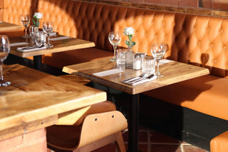 The Kilburn Coffee Tables, with their cast iron legs and reclaimed pine butcher's block tops aged over 100 years, completed these conversational spaces while echoing the venue's historic character. These pieces created intimate seating areas that balanced comfort with style, perfect for guests seeking a more relaxed atmosphere.
