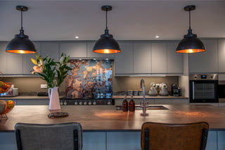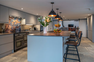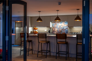 The barn’s kitchen features a large modern island with four Hammerwich Stools, in alternating colours, positioned in stoic form off the cantilevered breakfast bar. The gloss splashback combines copper tones and cooling greys in an oily marbled swirl. Three hanging pendant lights cast a warming glow of an evening, creating a sultry ambience for those late night chats over a glass of wine (or two!). Pendant lights are our bread and butter; we offer a wide range of options to suit all varieties of interiors.