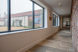 Exposed beams and brick work ensure that the heritage of this once agricultural barn is not lost. We love how our Vintage Window Frame Mirror, positioned alongside the brick-walled hallway, blends in with the cosy farmhouse theme. The distressed grid-format frame creates the illusion of a window, opening up the space and increasing light coming into this nook.