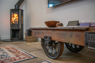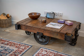 What better item of furniture to finish off this agricultural barn than Peppermill’s heavy and robust Industrial Cart Coffee Table, positioned in the lounge area. Stabilising wheels and a solid wood top make this historical piece ideal for use as an informal games table or to place your cafetiere on whilst it brews. Bogg Hall Barn has made a feature of this table by using it to hold trivia games and property information, helping guests settle into their temporary home.