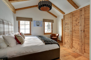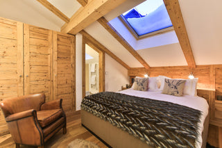 The chalet’s bedrooms are the ultimate alpine escape, with a careful selection of wintery hues and cosy layered textures from the wooden panelled walls, brown fur throw and grey fluffy rug to the upholstered neutral deer print cushions creating the perfect cosy feel. Every bedroom features our Professor Leather Armchair, and its rich chocolate buffalo leather brings rustic charm to the room. The handmade leather armchair really is a timeless piece that makes an incredibly comfortable reading chair.