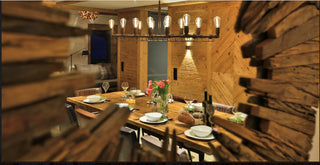 A true alpine chalet will always have a large dining area, overlooking the majestic mountains, acting as a central hub for guests to enjoy socialising and celebrate special moments together. Chalet Khione is no exception, and their dining area oozes charisma, style and character thanks to the Peppermill Furniture used. Chalet Khione has successfully achieved an alpine chalet decor, with bringing the outdoors in by incorporating our Tuscan Table Handmade from Reclaimed Rustic Timber Dining Table. At Peppermill we provide a bespoke furniture service, handmade in the UK, you can choose from oak extending tables, pine dining tables and more.