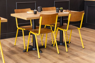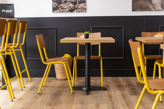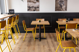 These distinctive chairs pair harmoniously with our Ashford Square Tabletops with X Bottom Bases, creating cohesive dining stations throughout the space. The tables offer the perfect balance of form and function, with oak effect, high impact laminate tops that resist scratches and stains, essential qualities in a food environment. The brown tabletops marry harmoniously with the distressed beech seats of the Luxor Chairs, whilst the industrial inspired black bases provide stability, ample legroom and ultimately contribute to the shop’s contemporary aesthetic.