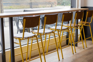 Our Luxor Wooden and Metal Chairs and Bar Stools in vibrant yellow perfectly capture Doughnotts’ rebellious, carefree vibe. These eye-catching pieces make a bold statement with their distressed beech seats and powder coated steel legs, adding precisely the pop of colour that reflects the brand’s energetic personality. The traditional stacking design of the chairs offers a practical storage solution for the bustling shop, whilst the plastic caps on each leg provide floor protection and enhance durability. The Luxor Bar Stools are strategically placed along the shop window, encouraging customers to people-watch whilst sipping on their coffee or snacking on a sweet treat. The combination of poplar wood, beech veneer and metal on the Luxor’s create seating that’s as sturdy as it is stylish, ideal for customers enjoying Doughnotts’ creations.