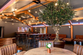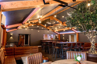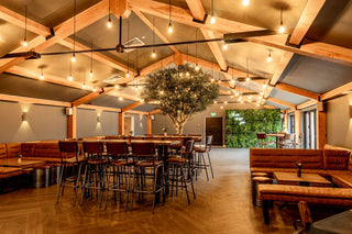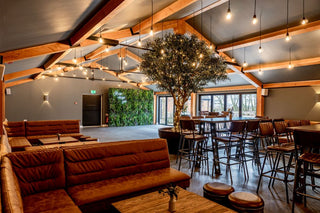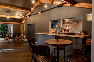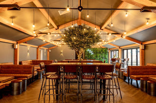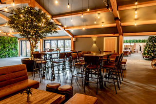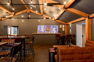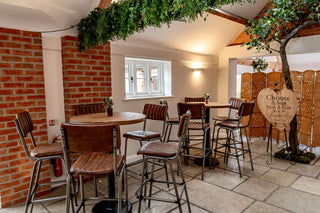 To complete the rustic style of the open beamed barn, Hanbury Barns uses the beautifully distressed Hammerwich Bar Stool in the colour Vintage Brown. These retro stools create a cohesive and inviting atmosphere when paired with the Zeppelin Poseur Table. Each one features a high-quality faux leather ribbed stitching with a durable gunmetal frame. Additionally, these stackable stools effortlessly complement the other brown furniture within the space!