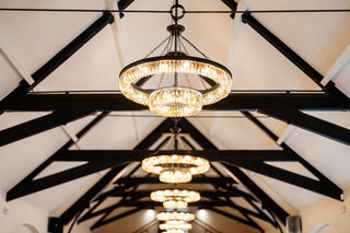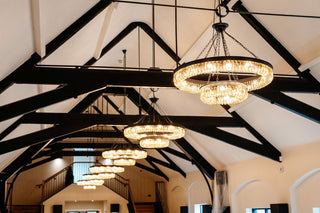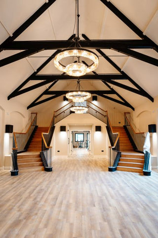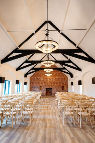Peppermill Interiors also stock a wide range of beautiful feature lighting, made to stand out and complete your commercial space. In Whistle Barns, the Kensington Amber Crystal Chandeliers have been hung along an open beamed ceiling which contrasts perfectly with the farmhouse designs, offering a retro look. The Kensington distributes light evenly throughout the venue, enhancing the warm and welcoming ambiance.
