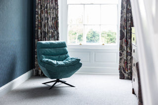 The cottage pays homage to its roots, with country style furniture, a country style kitchen and paneling in the hallway, but brings in a modern twist, with hints of blue and comfortable, modern armchairs to sit and chill out in. Our Darcy Swivel Chair occupies the bay window of Knott Cottage and complements the fresh modern décor throughout.