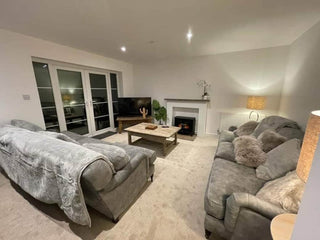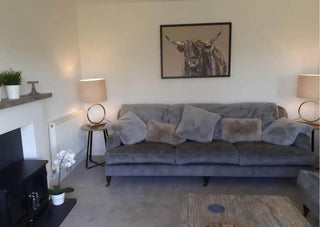 The living room features our plush grey Mirren Velvet Sofa, which is super comfortable to lounge around in when it gets a bit cold outside.
