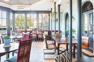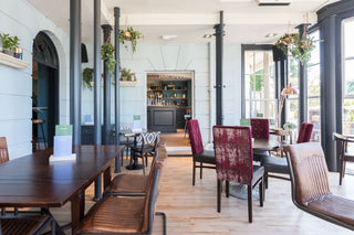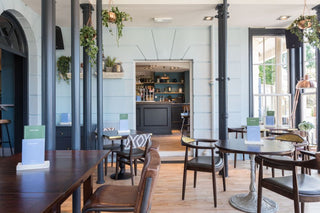Working with pastel blue hues, baroque style table bases and large round windows, the Goodwood dining chairs help create a sophisticated interior space at Pitcher & Piano in Richmond, London.