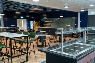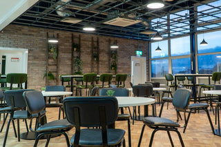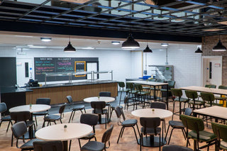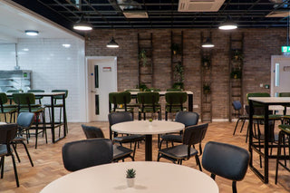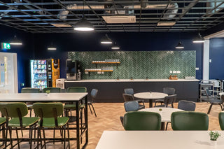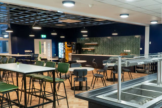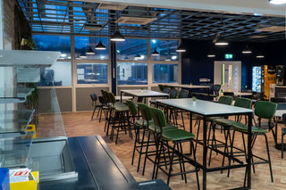 Each one of the London chairs and stools feature a plush, faux leather seat and backrest to ensure unmatched support when eating and socialising. Better yet, the Racing Green stools match the tiles behind the canteen and the Oxford Blue dining chairs match the painted blue walls.