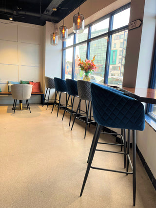 For their coffee counter section, St Honoré opted for a mix of Peppermill’s Renoir Velvet Bar Stools in Lakeside Blue and Palette Grey to seamlessly blend with their neutral interior and beautiful blue painted window frames. Upholstered in soft, plush velvet, the Renoir Bar Stools have a quilted back and add a luxurious but contemporary feel to the patisserie.