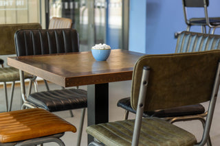 The Copper Edge Tables in both round and square create striking centrepieces that work seamlessly alongside the Arlington chairs. These characterful wooden tables feature premium copper edging with stud detailing, establishing a memorable aesthetic that transforms the dining experience. The warm copper tones harmonise beautifully with the rich leather seating, while the industrial inspired design threads through the college's modern interior scheme. Available with various base options, these tables illustrate how intentional furniture choices can reimagine dining areas as destinations where students feel valued.