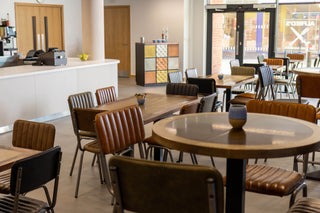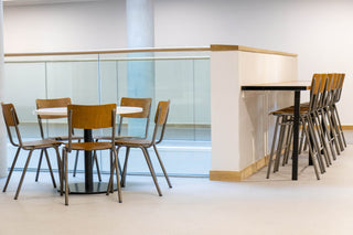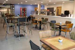 The Luxor Stacking Chairs have become central to Tamworth College's identity, perfectly complementing the institution's modern, industrial aesthetic. Built from distressed beech with gunmetal powder coated steel legs, these chairs deliver both resilience and visual impact, essential for busy educational spaces that demand furniture capable of enduring constant daily use. The natural wood tones paired with the cool gunmetal finish create a refined, understated atmosphere throughout cafés, dining areas, and collaborative zones, while the traditional stacking design allows for effortless storage and quick reconfiguration. Similarly, the Luxor Bar Stools extend the same contemporary, industrial character to elevated seating areas across the college. Constructed from beech veneer with a distressed finish and featuring the same gunmetal powder coated steel legs, these stools maintain visual consistency throughout bars, breakout spaces, and social zones. They share the durability and design strength of the Luxor chairs, creating furniture that stands up to the rigours of college life while fostering an atmosphere that feels fresh, inviting, and full of opportunity.