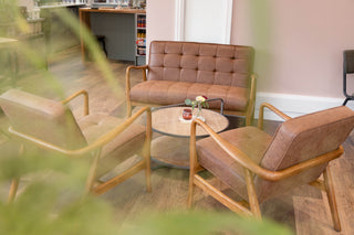 The Florista has created an inviting lounge area that encourages customers to settle in and stay awhile. The Salisbury Vintage Style Seating Range forms the centrepiece of this space, featuring armchairs and a two-seater sofa upholstered in warm tan distressed faux leather. Inspired by a 1950s design by Arne Vodder, these pieces bring timeless appeal to the coffee shop through their handcrafted ashwood frames and luxurious upholstery. The warm tan tone complements the overall colour scheme whilst adding vintage charm that feels both nostalgic and contemporary. Fresh flowers on display throughout the shop bring bursts of vibrant colour that enliven the space, their seasonal blooms perfectly complementing the thoughtfully chosen furnishings. This carefully arranged seating area provides the ideal spot for customers to unwind with their coffee, browse through their fresh bouquet, or simply enjoy a quiet moment away from daily life. The Salisbury range demonstrates the harmonious relationship between comfort and design, offering a welcoming retreat that invites visitors to linger.