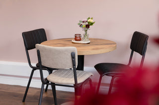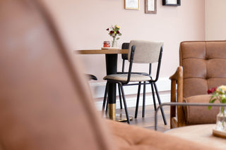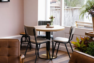 Throughout the space, The Florista showcases meticulous attention to detail in every furniture choice. The Ashford Round Country Oak Top Café Tables anchor the dining area with their distinctive brass and black bases, creating striking focal points within the interior. These pieces feature oak-effect high impact laminate tops that resist scratches and stains, maintaining their polished appearance through countless coffee dates and flower arranging. The Jubilee Dining Chairs complement these tables with their faux leather upholstery, ribbed stitching, and black powder-coated metal frames. Their stackable design offers flexibility, while the varied colour palette of subtle, sophisticated tones enhances the overall aesthetic. Together, these carefully curated pieces exemplify the modern character that defines The Florista's interior, creating an environment where comfort and style are a priority.