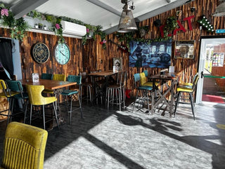 Peppermill’s high bar stools are displayed around the poseur table, in muted yellows, teals and greys, to add subtle pops of colour against the dark wood walls. Whether you choose to enjoy your drink in the Hammerwich, Admiral Wingback or Mini Goodwood, each stool has a distressed, industrial style that sits perfectly alongside the engine table.