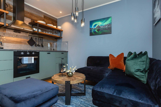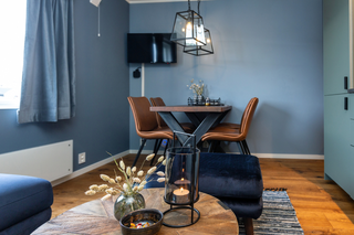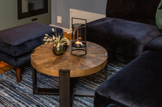 The Hoven apartment overlooks the pier, making it perfect for sipping a hot drink whilst gazing out at the fishing boats outside. With blue painted walls and furnishings, this particular room has a cosy, nautical theme. As such, our Keaton Round Wooden Coffee Table feels perfectly at home here. With black metal and natural elm wood, the Keaton Round Wooden Coffee Table has plenty of originality and a star base shape.