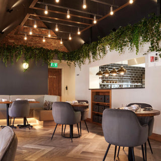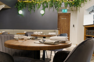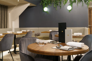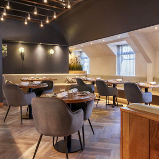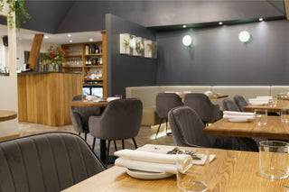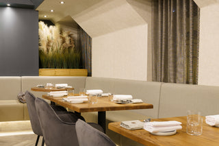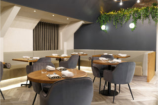 Colours and textures have been repeated throughout to create a symbiotic and unified space. Lowry Velvet Dining Chairs are interspersed around the restaurant. The palette grey colourway complements the bold, deep grey walls, adding to the lavish dining experience. A plumptious, stone-coloured booth-style seat wraps its way around the room and is finished with under-seat lighting.