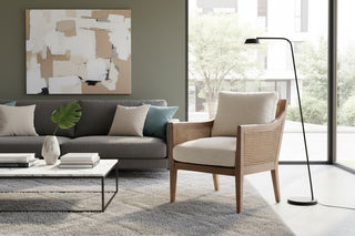 The Tuscany Rattan Side Chair in black seamlessly blends modern country style with Japandi influences, adding a sophisticated, natural touch to any contemporary space. Its gracefully sweeping arms are accented with intricate rattan detailing, creating an airy, textured look that complements its sturdy black oak frame. Upholstered in soft linen, the seat provides both comfort and understated elegance, balancing natural materials with refined lines. This chair’s effortless charm makes it ideal for a variety of settings, from home dining rooms to stylish commercial spaces, bringing a warm, chic presence that enhances any interior with a touch of relaxed sophistication.