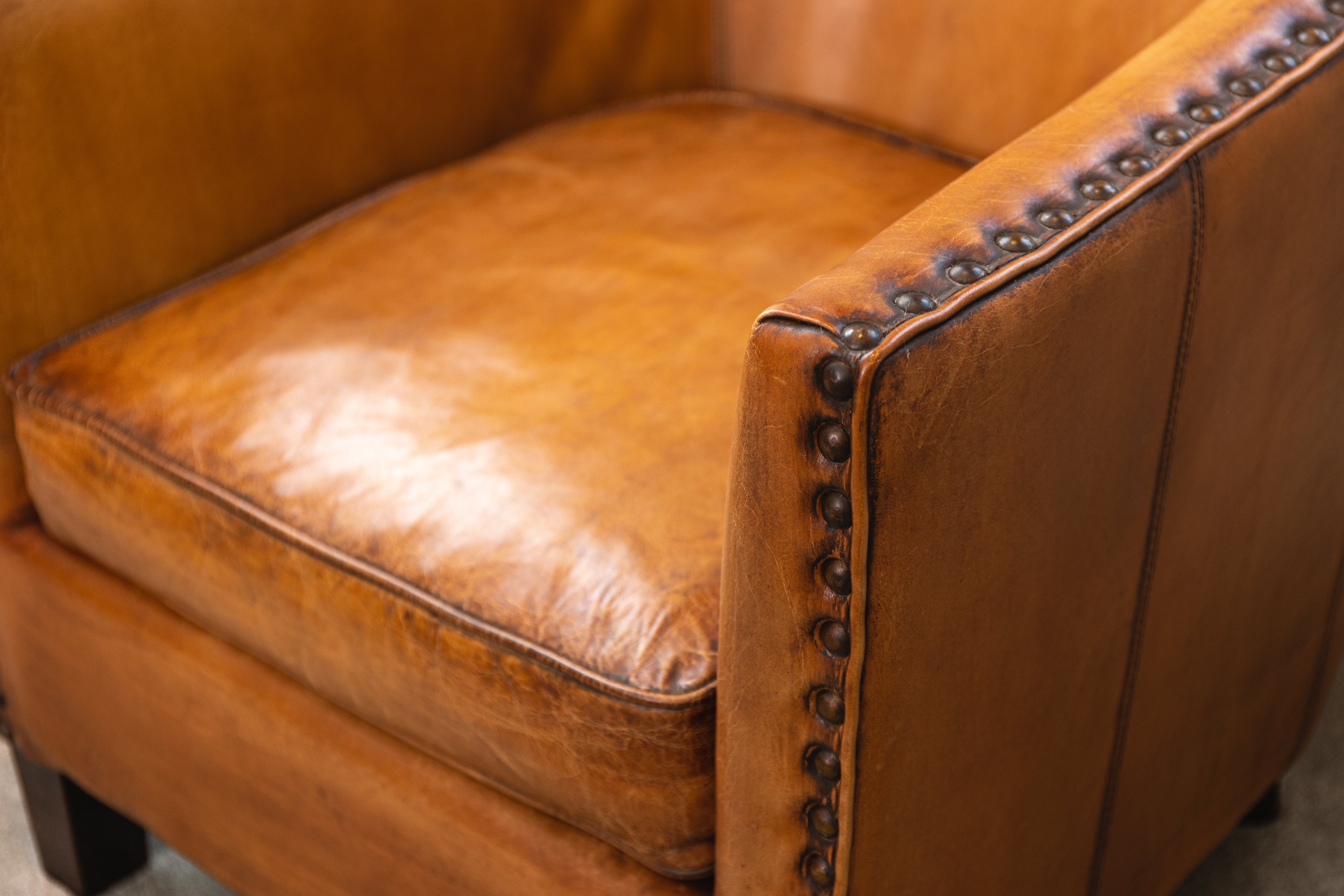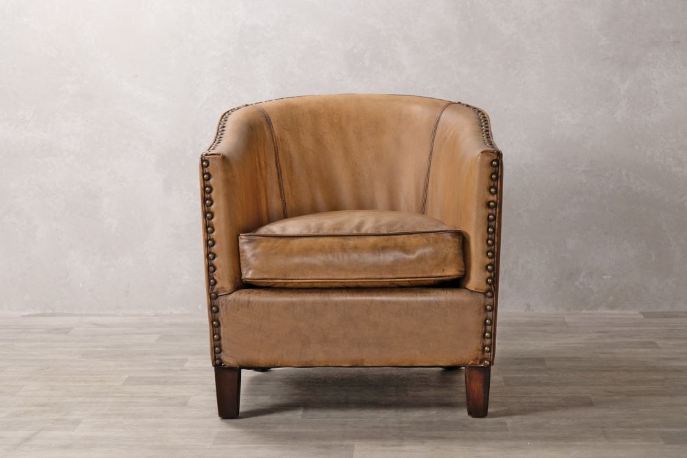 Cute but classy, the Wolseley Leather Tub Armchair has studded brass edging and subtle detailing to the chair, the authentic leather has a slightly worn finish for added character. The tub chair is small enough to suit hallways and small corners, too!