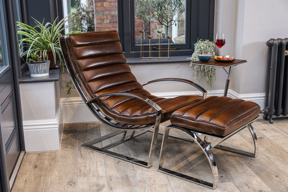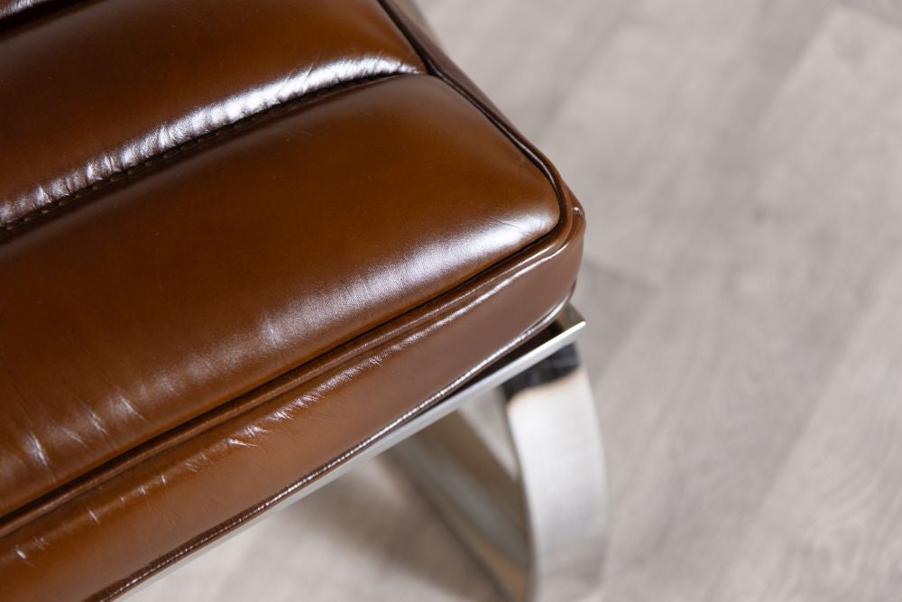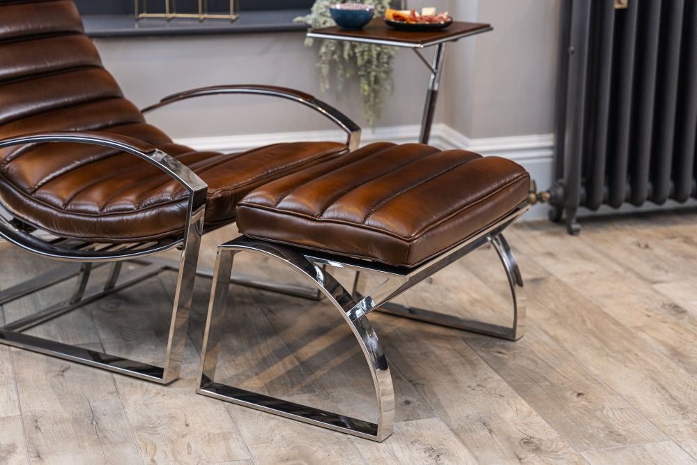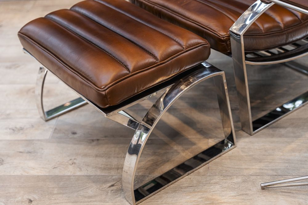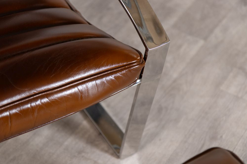 Indulge in refined design and high quality materials with the Marlborough Leather Seating Range. Immerse yourself in art deco inspired richness sitting on a chrome base with clean, sleek lines. The leather armchair and matching pouf is a modern take on a classic style.
