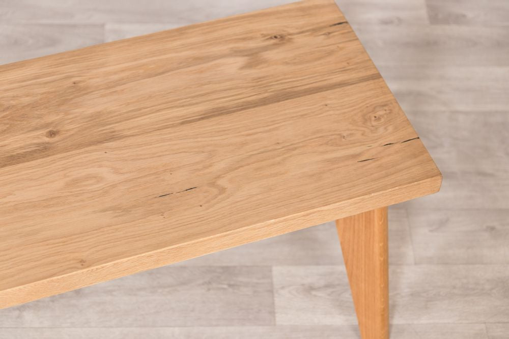 Enhance your living space with our Oak Tapered Bench. Crafted from high-quality oak, this beautifully designed bench features elegant tapered legs that provide both stability and style. The natural grains and knots in the wood add character and rustic charm to any setting. Whether placed in your entryway, dining room, or bedroom, this bench brings a touch of elegance and warmth to your home. Perfect for those who appreciate the beauty of natural wood and timeless design.