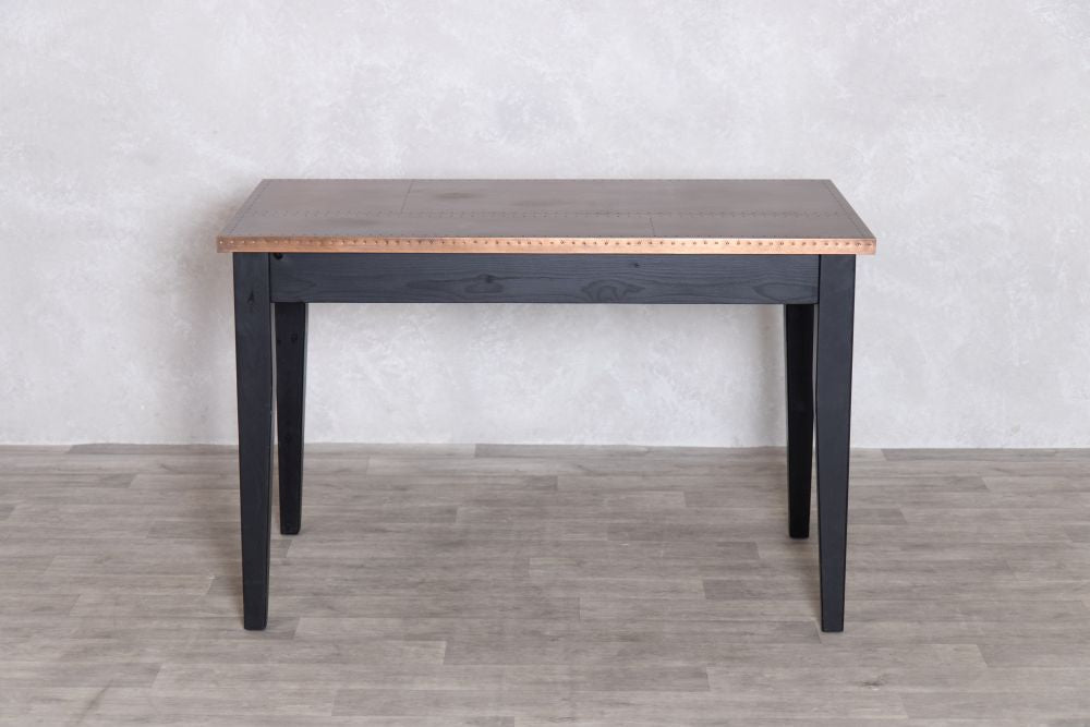 Enhance your customer experience and bring industrial style to your restaurant with the Copper Top Tapered Leg Medium Dining Table. The tapered legs give the restaurant table a sleek appearance.