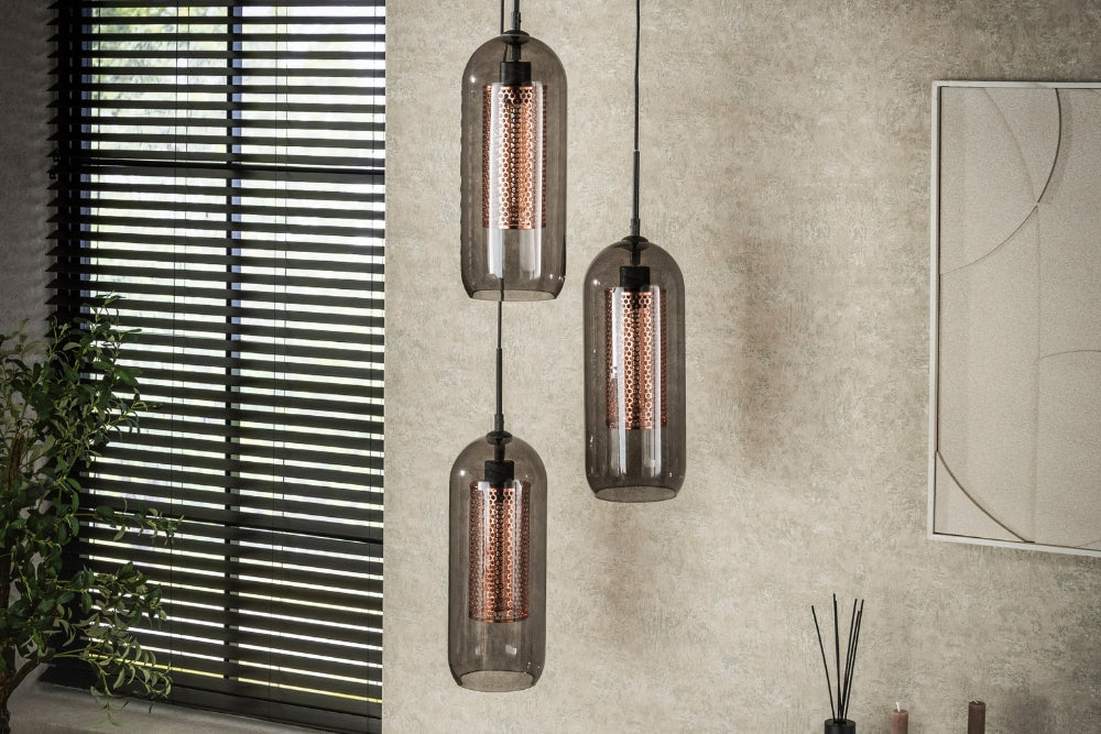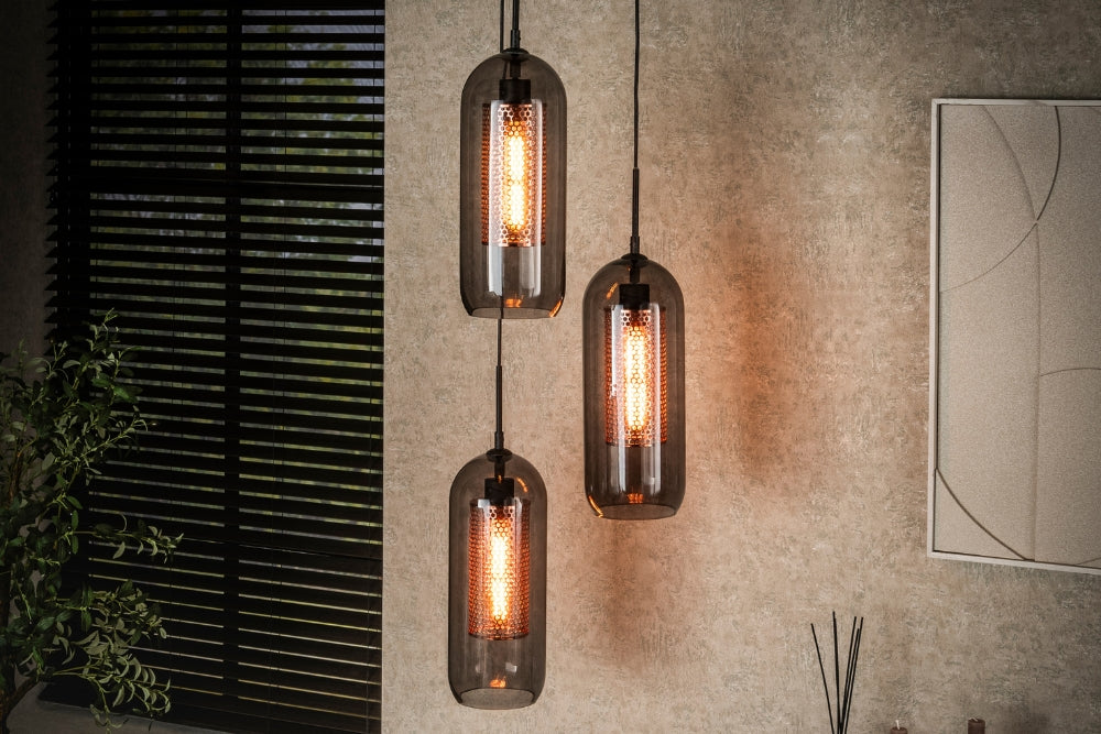 The Harmony 3 String Pendant Light is a stunning and captivating lighting fixture, featuring three hand-blown smoke glass shades, each containing a cylindrical copper mesh inner shade. This tiered pendant creates a truly mesmerising and chic visual effect. The combination of the smoky glass and metallic copper mesh not only gives the Harmony a trendy and elegant look, but also expertly distributes the light throughout the room. Adjustable up to 180 cm in height, the Harmony 3 String Pendant Light allows you to customise the lighting to suit your specific needs, whether in a residential or commercial setting. With its unique blend of materials and thoughtful, multi-layered design, this pendant light is a sophisticated and visually striking addition to any modern or transitional interior.