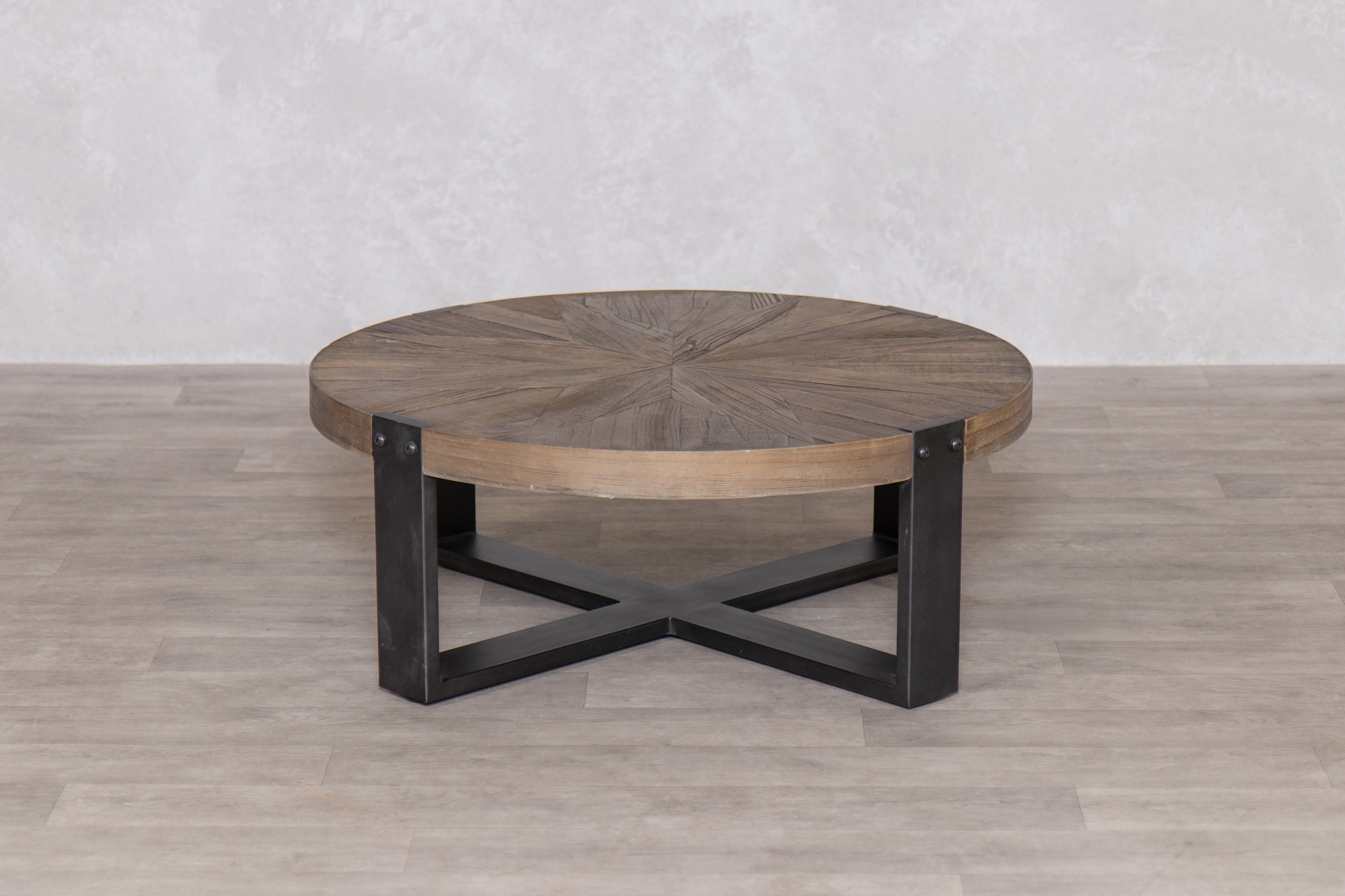 The mix of black metal and natural elm wood creates an idyllic industrial coffee table. The Keaton Round Wooden Coffee Table still has plenty of originality, with unique grooves and knots adding character, and the star base shape makes this round coffee table an authentic piece of furniture for your living room.