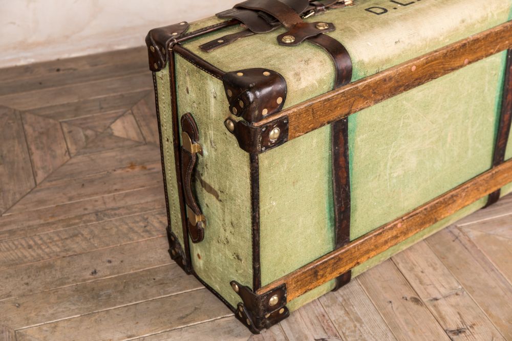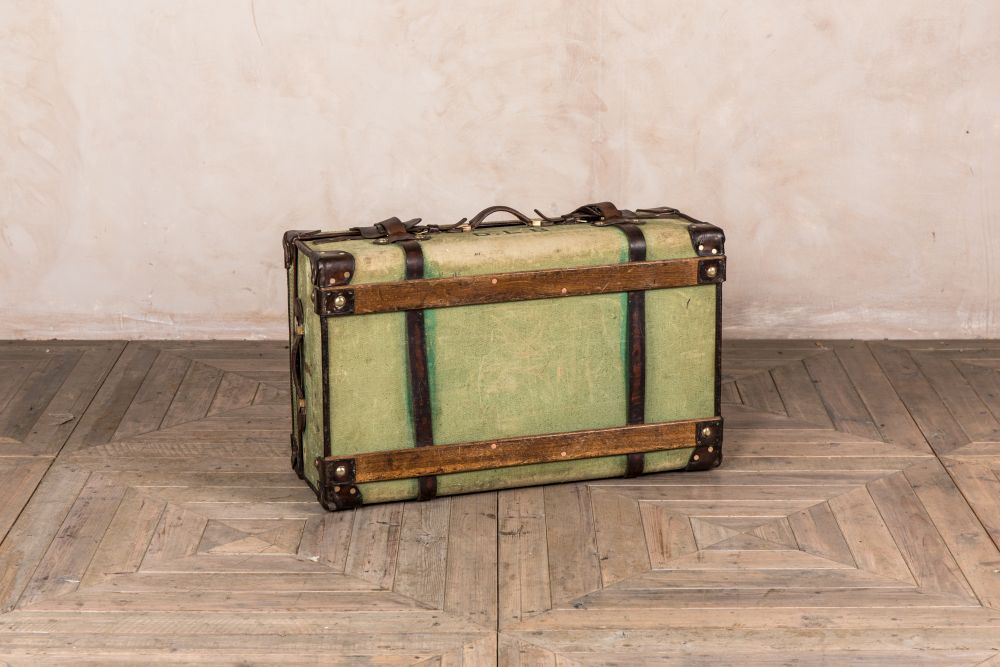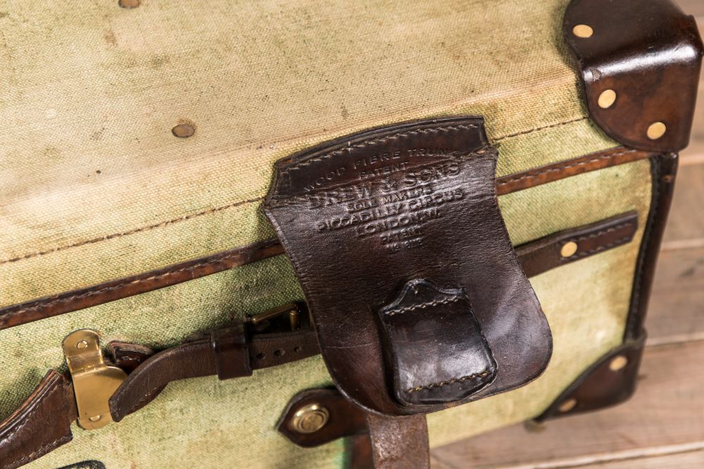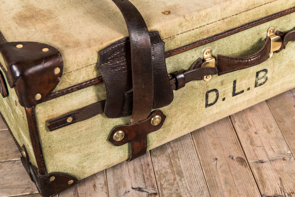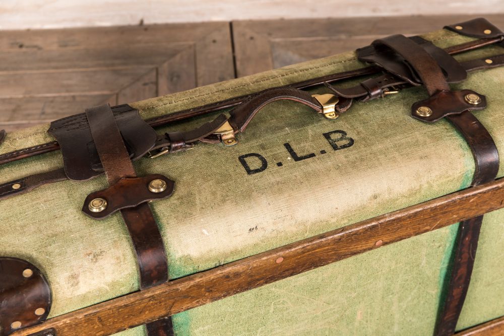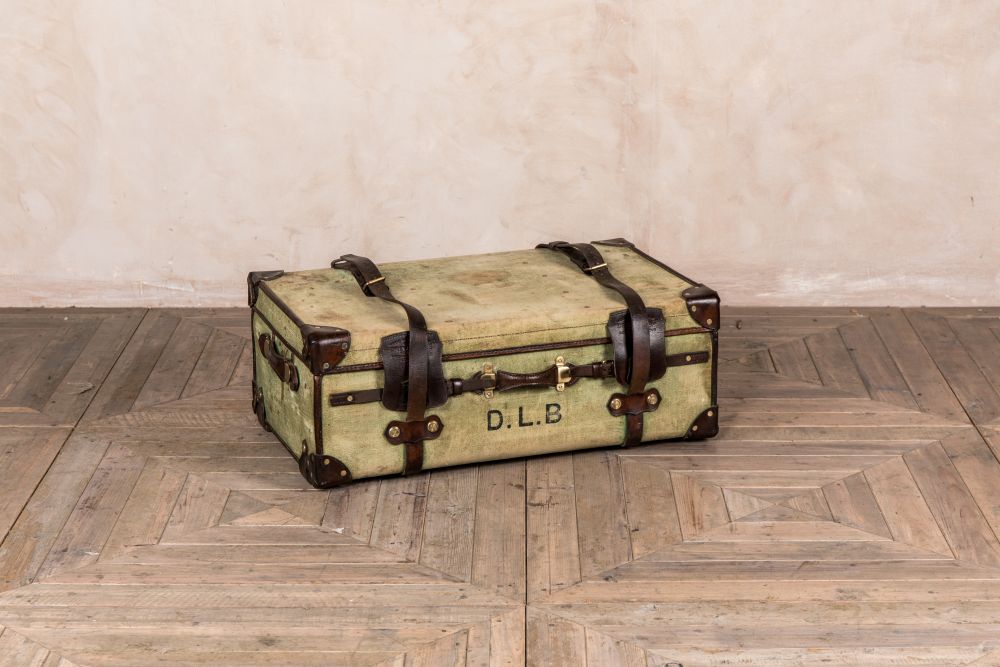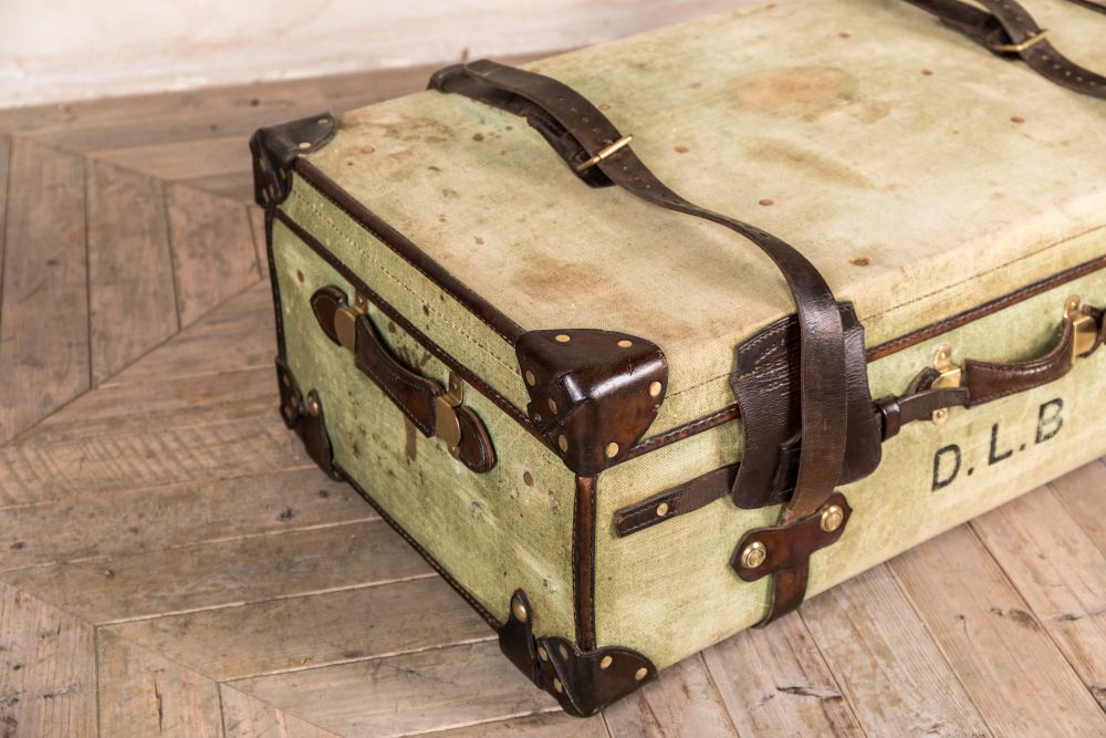 This suitcase is made from canvas, with wooden and top quality leather detailing. On the front of the case is the previous owner’s initials. The canvas was once cream but over the years has taken on a distressed appearance. We feel that the wear and tear along with the initials adds to the suitcase’s unique history and character.