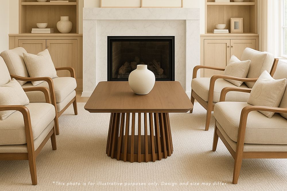 The Darcy Rectangle Coffee Table brings a unique and contemporary feel to your living space. The twin pedestal design features gently sloping wood slats which create a stunning design feature and make the table a beautiful focal point in your room. Crafted from solid hardwood in a natural finish to show the grain of the timber, this striking piece provides ample surface space for entertaining, displaying decorative items, or everyday use. The sculptural slatted pedestals add visual interest and architectural detail, while the generous rectangular top makes it both a practical and eye-catching centrepiece for your lounge or living area.