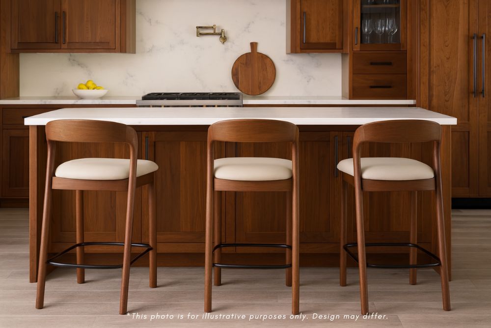 The Margot Counter Stool features a simple yet captivating design for modern dining spaces. Rounded, sturdy timber frames soften the space and create a visually soft silhouette that works beautifully at kitchen islands or breakfast bars. The curved backrest flows seamlessly into the frame, forming a continuous line that enhances the stool's sculptural quality. The warm walnut hardwood tone contrasts beautifully with the full leather upholstered seat, providing both comfort and style. A black metal footrest offers practical support and creates a striking detail against the warm timber, making this counter stool a perfect blend of form and function for elevated dining and entertaining.
