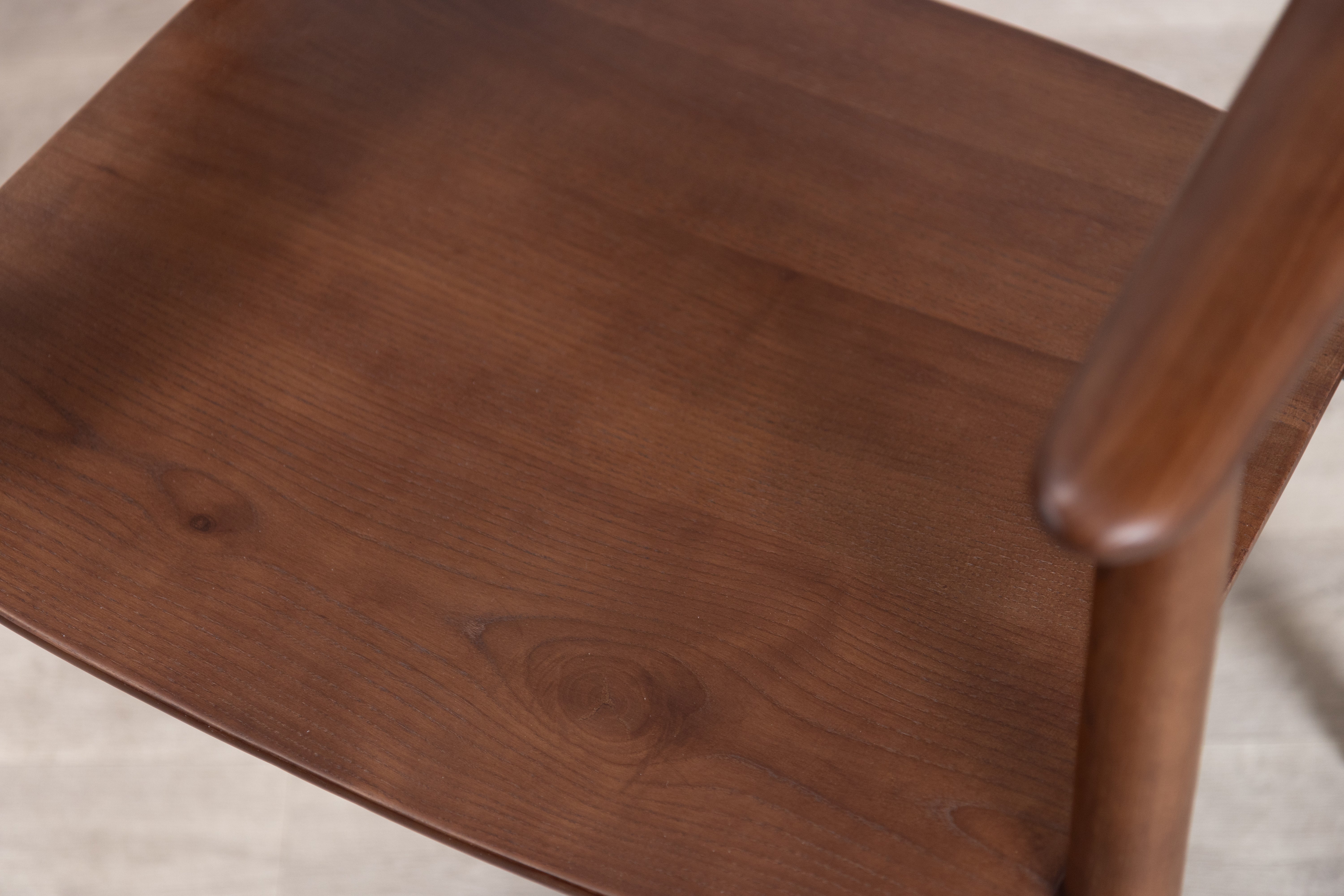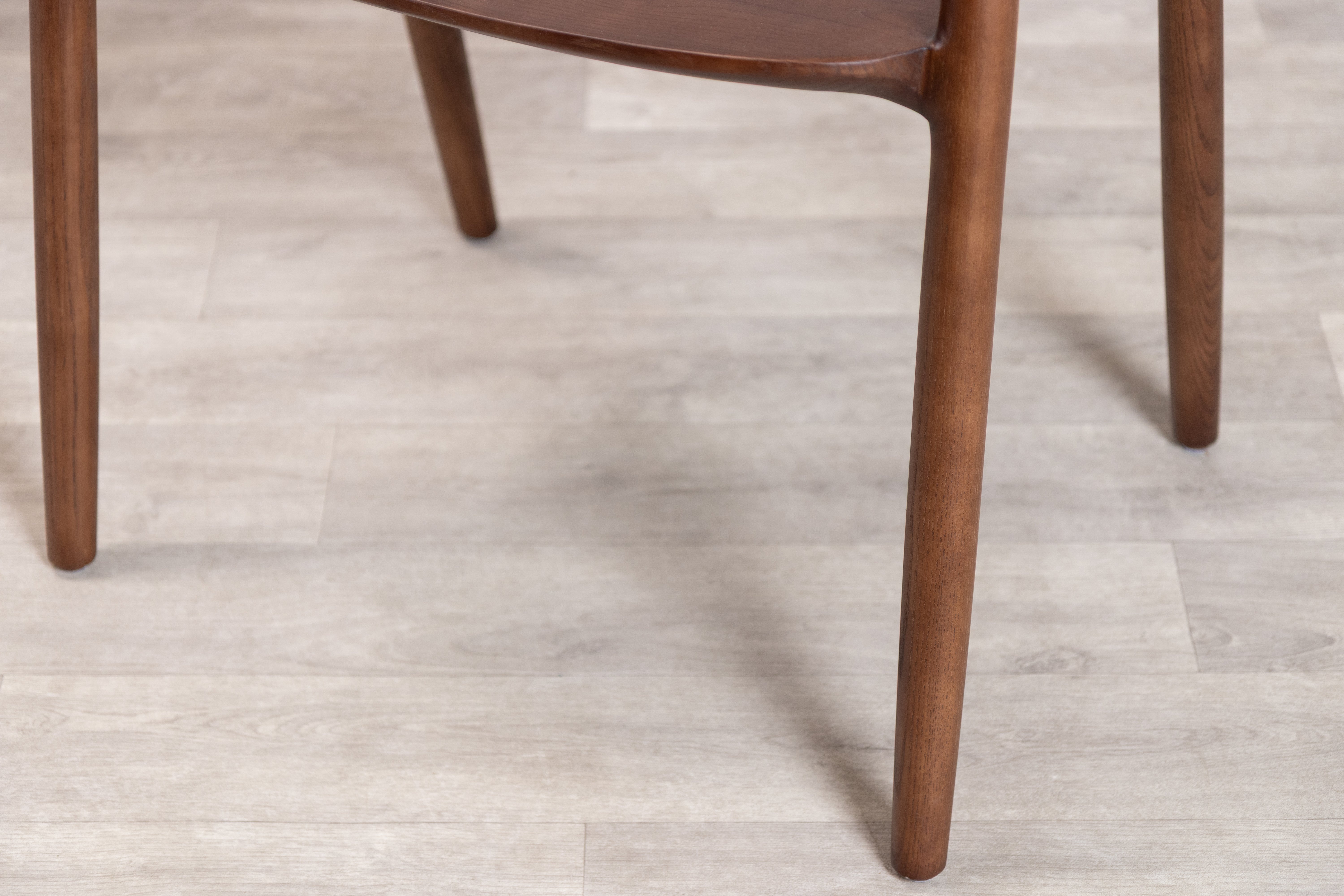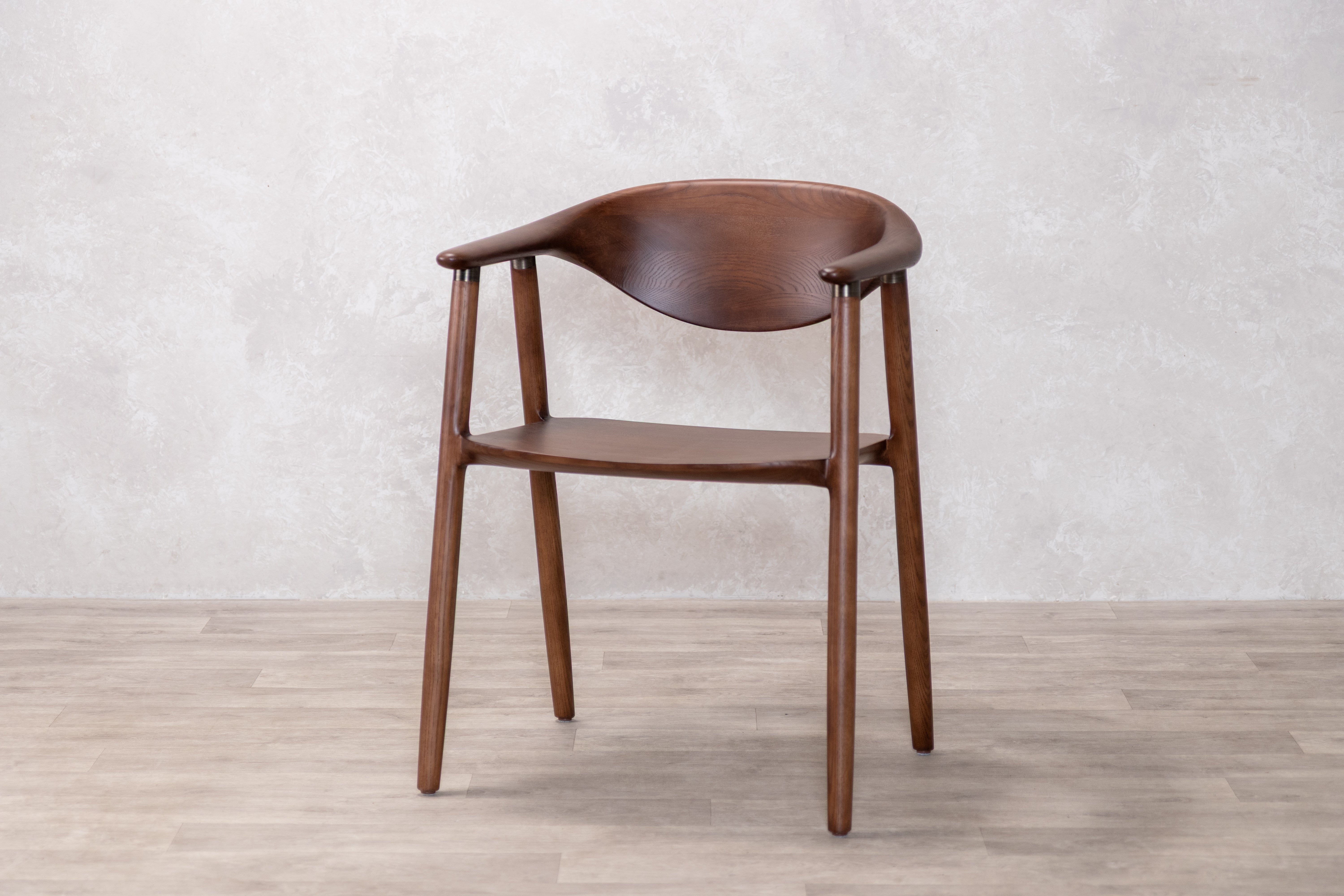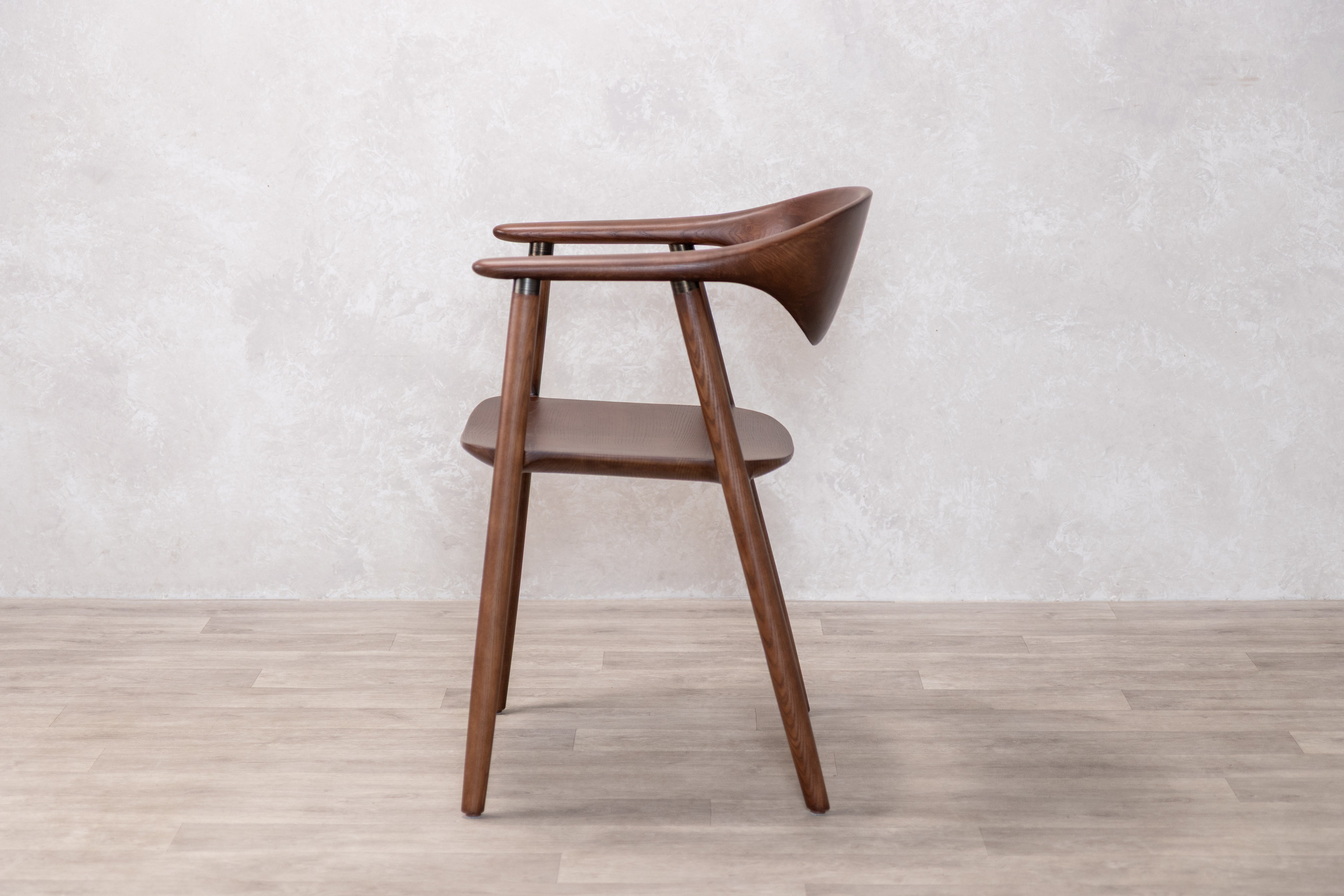 The Aston dining chair features a walnut-stained solid ash wood frame accented with brass details that highlight its distinctive construction. The impressive backrest design centres on an oval thinning silhouette that seamlessly transitions into the armrests, creating an ergonomic flow that prioritises both comfort and visual interest. Metal reinforcements where the armrests connect to the wooden legs provide structural integrity while adding subtle industrial notes to the Scandi-inspired aesthetic, resulting in a piece defined by clean, simplistic lines that balance form with function in any contemporary dining space.
