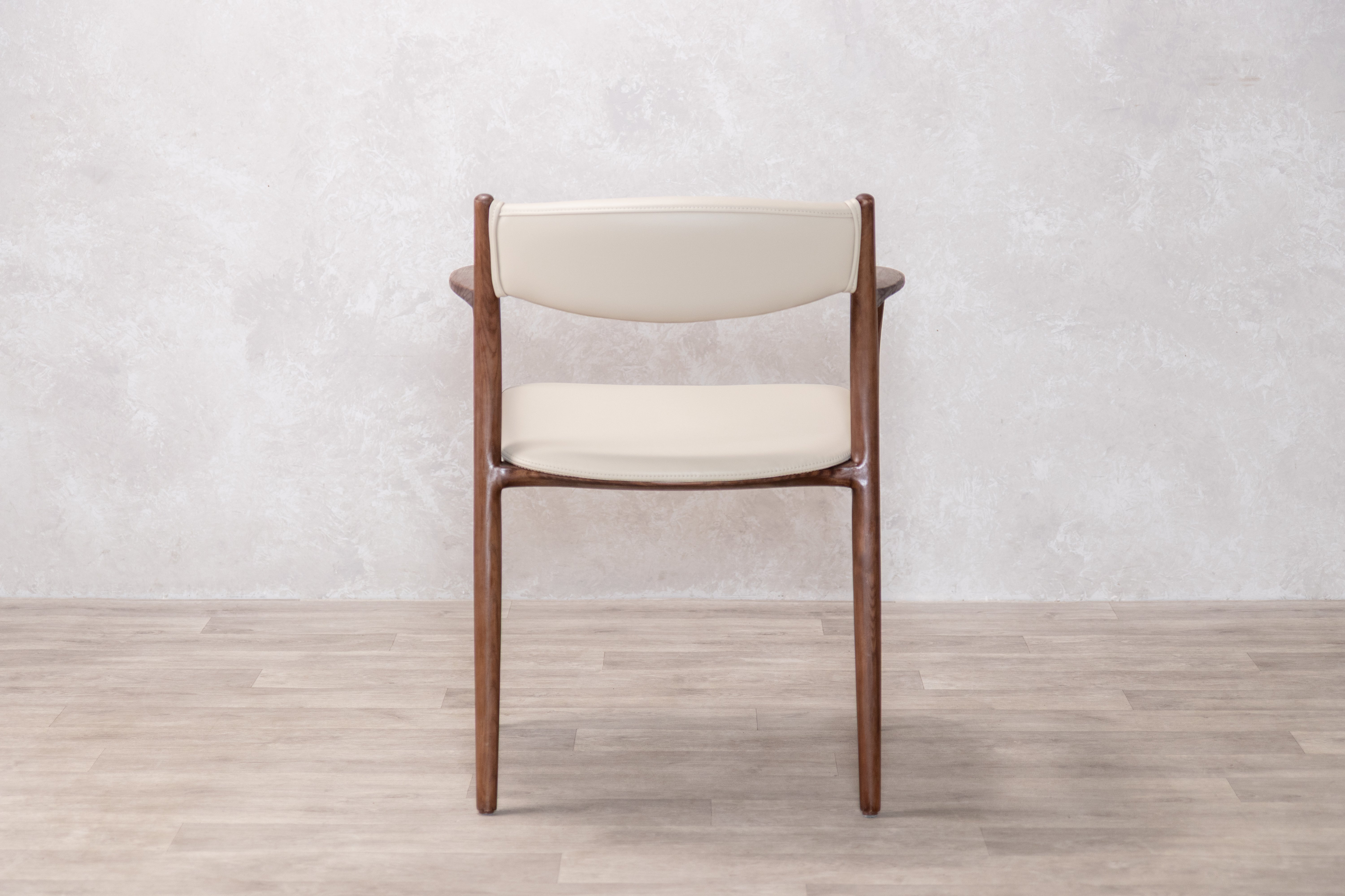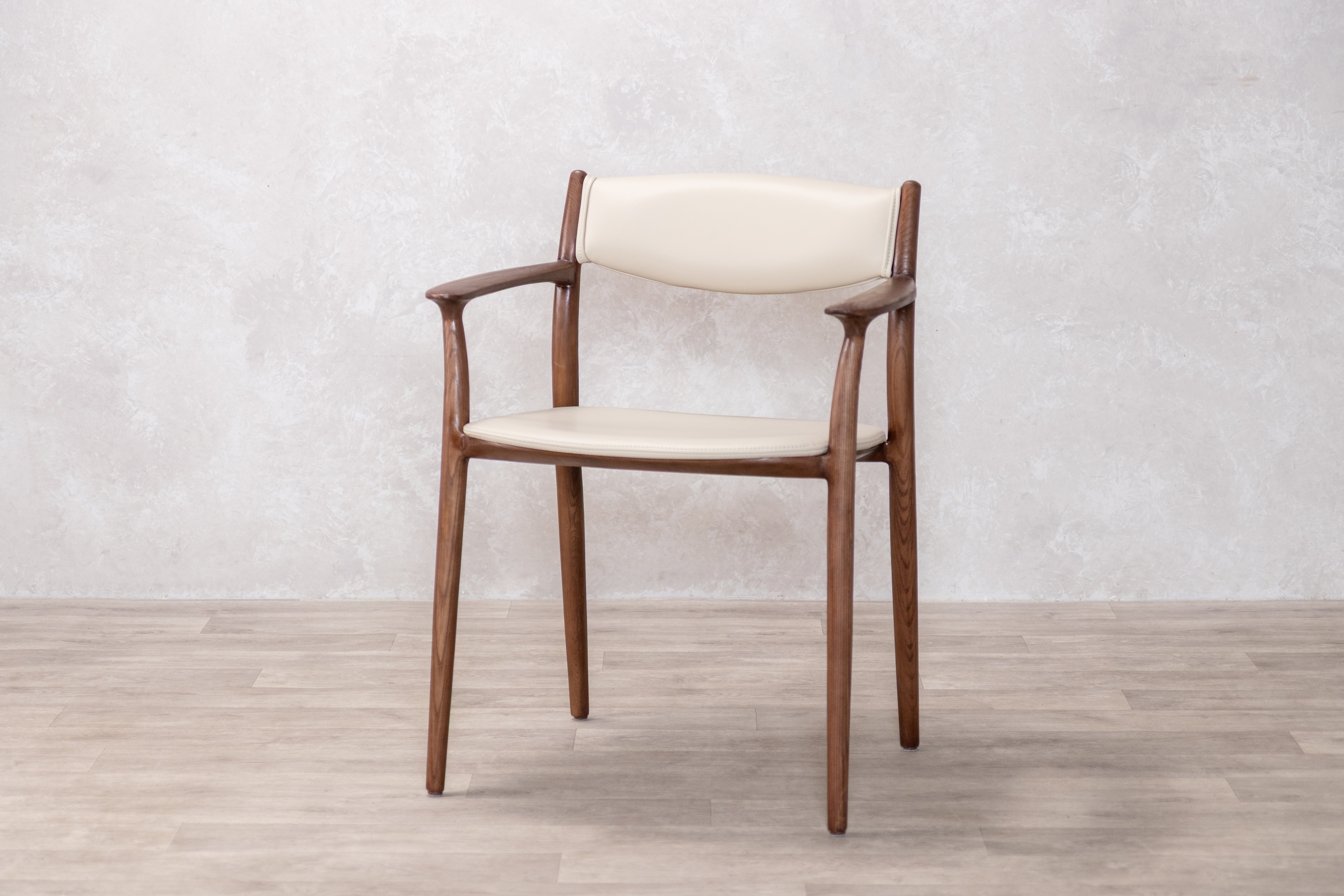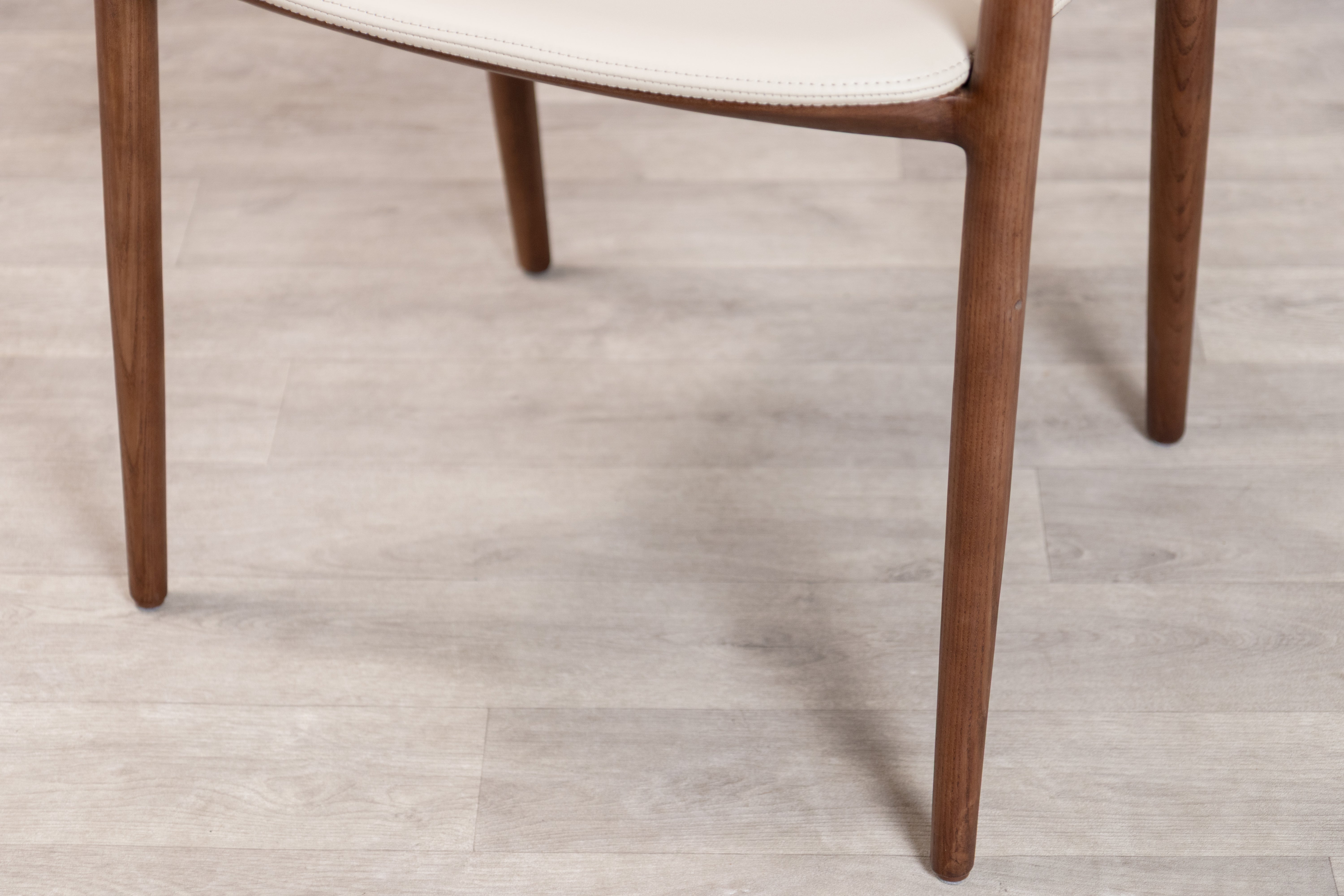 The Belvedere dining chair showcases organic beauty through its meticulously crafted solid ash wood frame, where thin lines and a gently curved silhouette create a sense of refined simplicity. The open back design allows the natural grain of the wood to take centre stage while maintaining an airy, contemporary aesthetic that works seamlessly in both dining and occasional seating arrangements. Neutral PU Leather upholstery on the fixed seat and back provides comfort without overwhelming the chair's graceful profile, making it a versatile piece that adapts to modern interiors while celebrating the inherent character of natural materials.