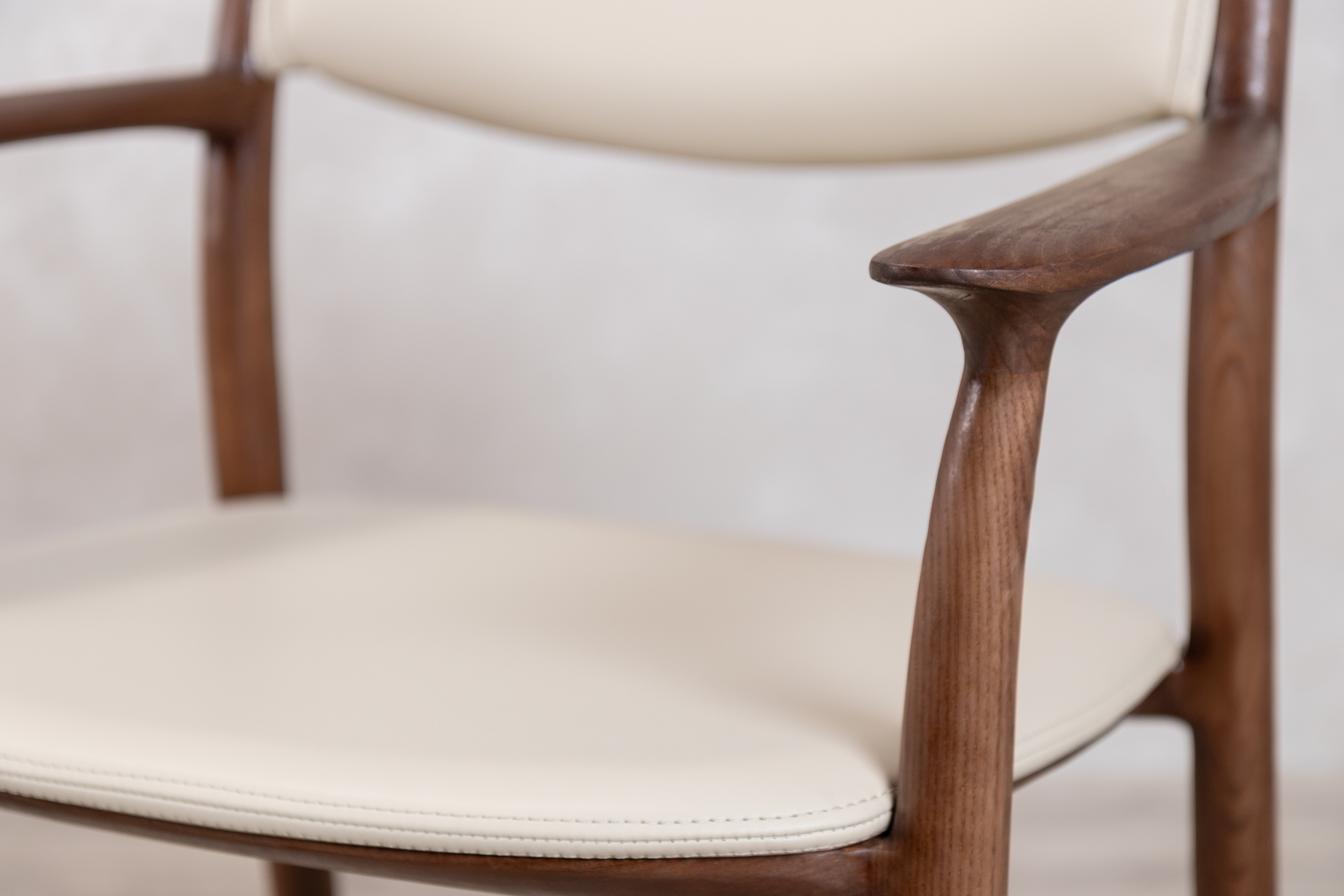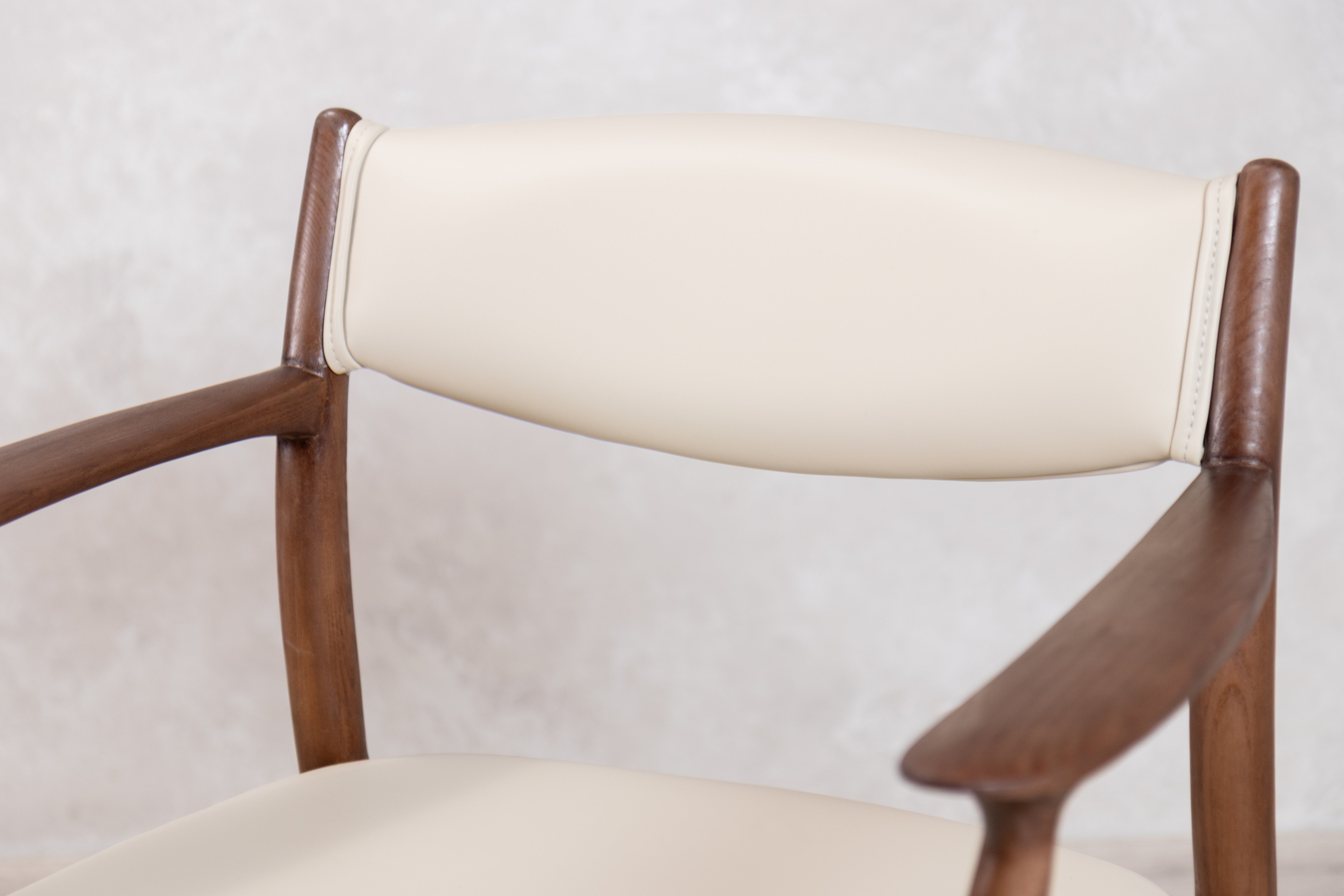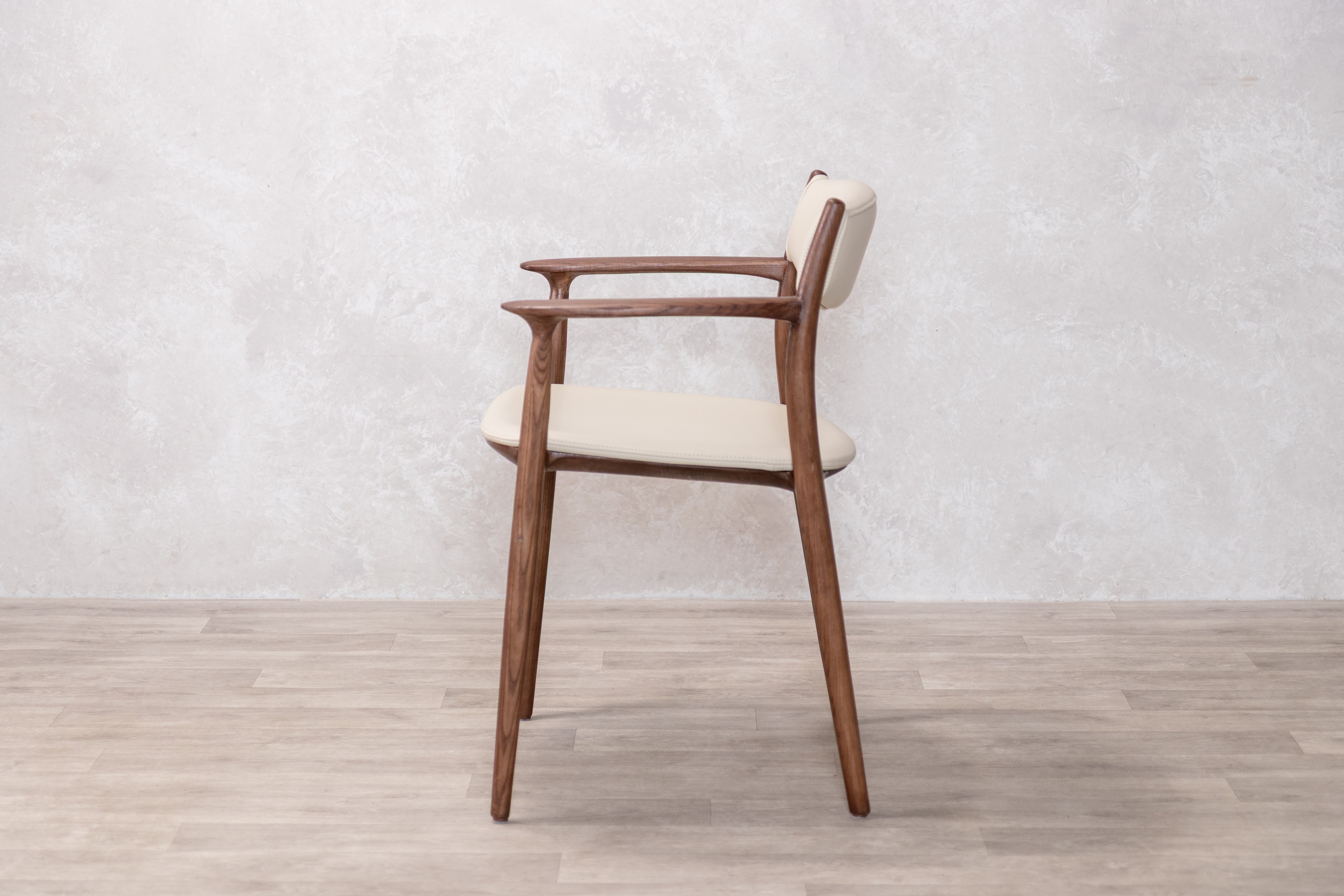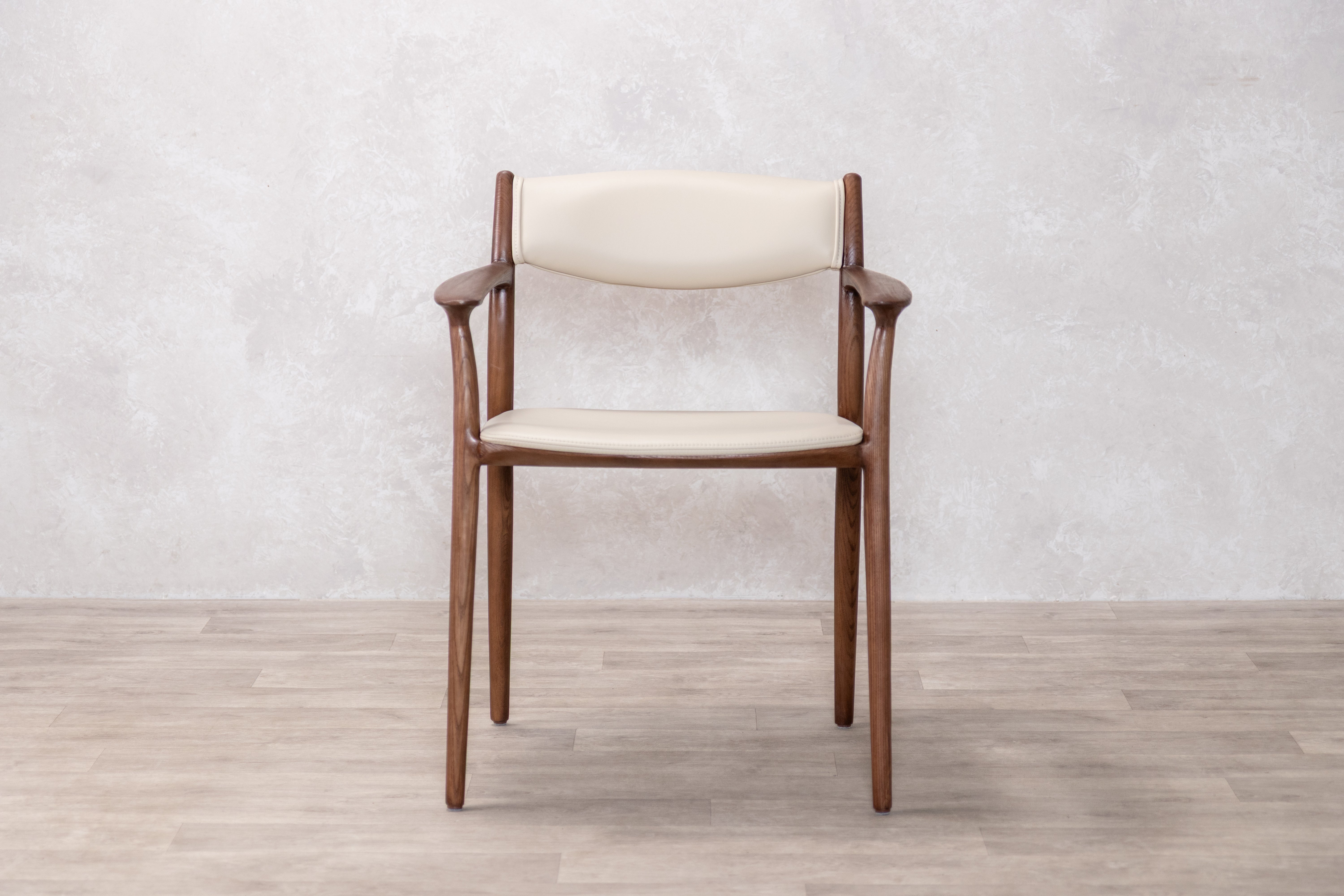 The Belvedere dining chair showcases organic beauty through its meticulously crafted solid ash wood frame, where thin lines and a gently curved silhouette create a sense of refined simplicity. The open back design allows the natural grain of the wood to take centre stage while maintaining an airy, contemporary aesthetic that works seamlessly in both dining and occasional seating arrangements. Neutral PU Leather upholstery on the fixed seat and back provides comfort without overwhelming the chair's graceful profile, making it a versatile piece that adapts to modern interiors while celebrating the inherent character of natural materials.