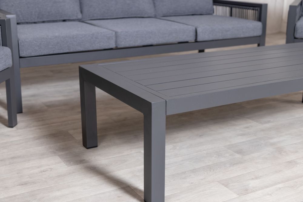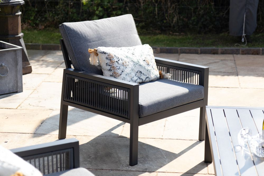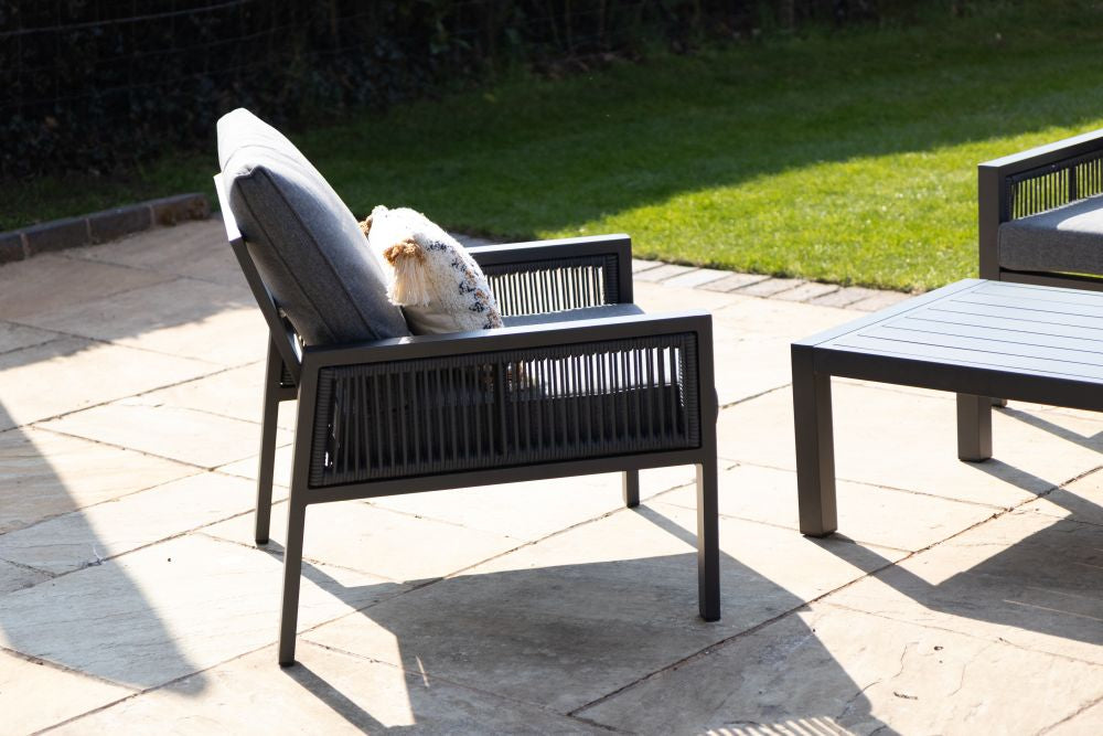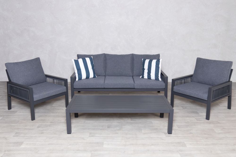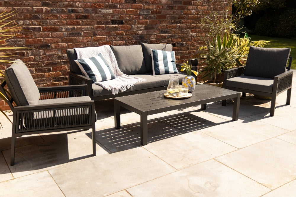 Transform your outdoor space into a cosy retreat with Amalfi Outdoor Sofa Set, which includes a sofa, two chairs, and a coffee table - ideal for gardens, patios, balconies, restaurants, and coffee shops. The dark grey aluminium frame is lightweight yet durable, offering rust and corrosion resistance with its powder-coated finish. The dark grey rope side detail adds a touch of sophistication, while the thick, soft cushions made from high-density sponge and high-quality polyester ensure ultimate comfort. These cushions are showerproof, weather-resistant, and UV-resistant, making them perfect for outdoor use.