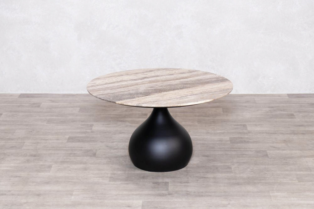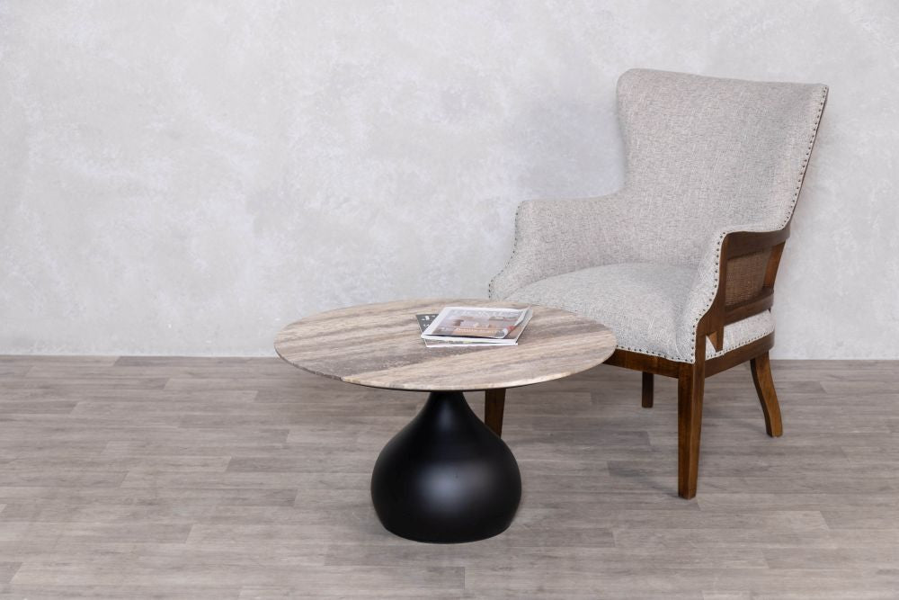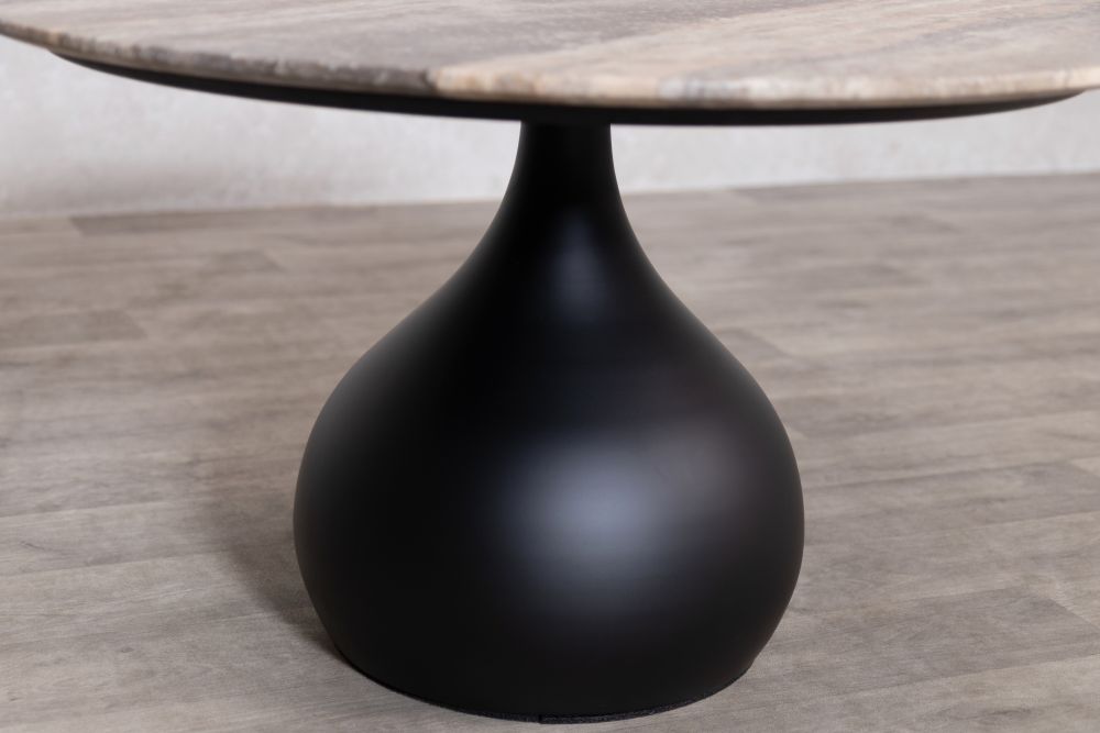 The Bicester Travertine Round Coffee Table is a striking blend of modern design and natural elegance. Featuring a unique teardrop shaped matt black base, this table offers an eye-catching sculptural look. Topped with a luxurious travertine limestone surface, this table brings refined sophistication to any living space whilst serving as a functional and stylish centrepiece. Shaped by nature over countless ages, each piece of travertine limestone carries a unique story in its patterns.