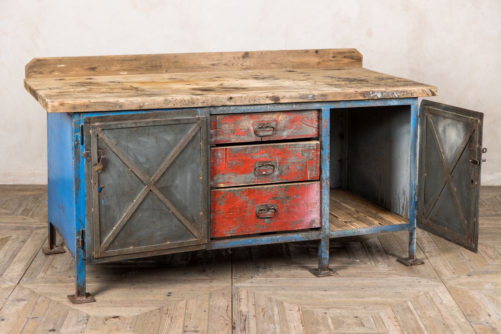 The metal sideboard has a lot of unique character and will be a practical piece of furniture. It is useful for restaurants with its drawers for storing menus, table numbers and cutlery, and with a wooden top, it provides plenty of space to prepare.