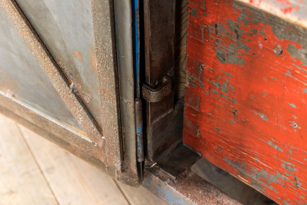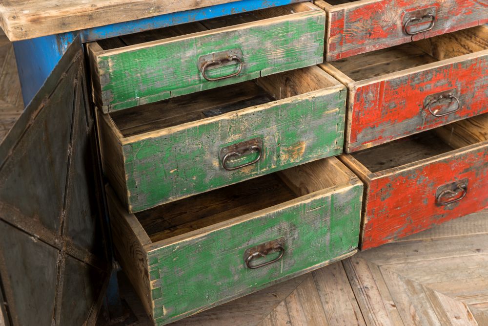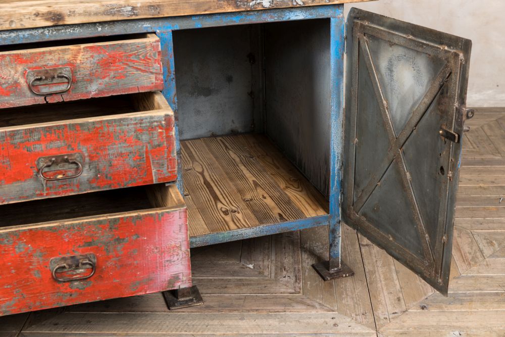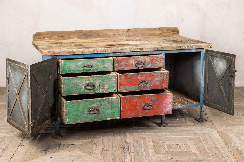 Unlock magical hidden drawers with this Distressed Vintage Metal Sideboard. From the outside, it looks like a typical industrial sideboard, but once you pull back the cupboard doors, you are in for a treat!