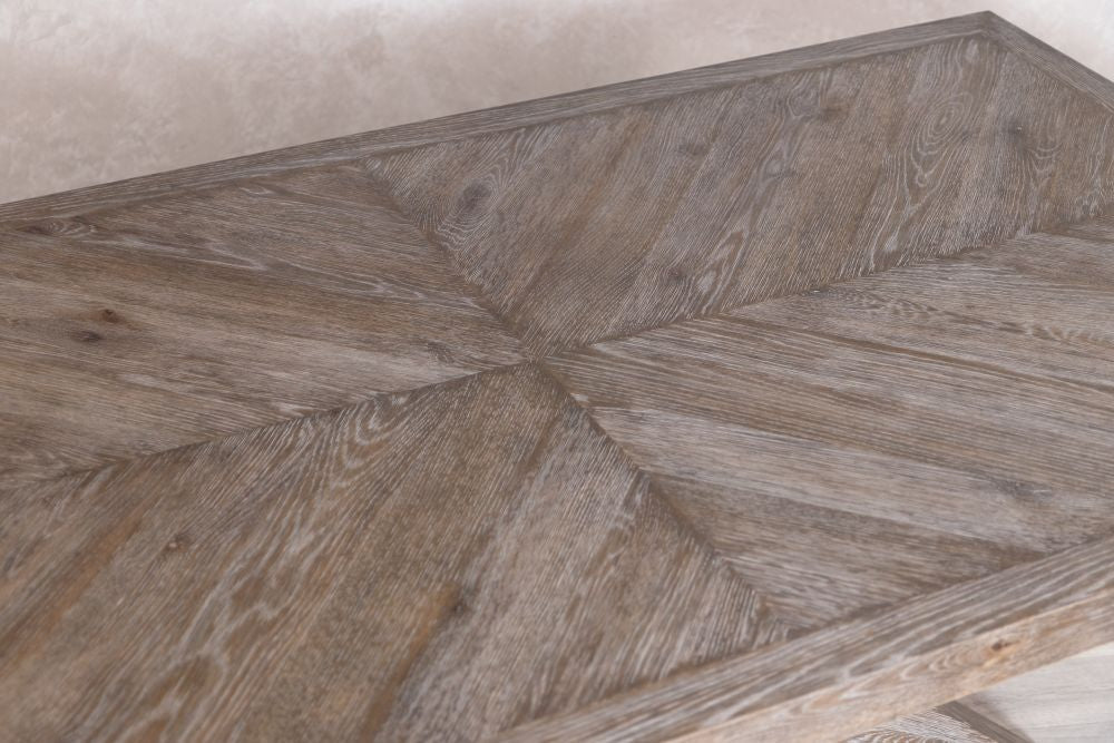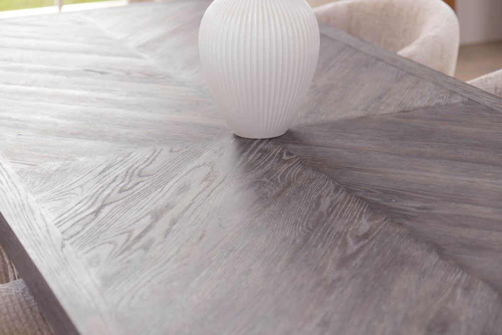 The Farringdon Dining Table is a statement piece perfect for modern-inspired interiors. Crafted from premium oak veneer, it's stunning herringbone top adds a touch of timeless elegance and intricate detail.