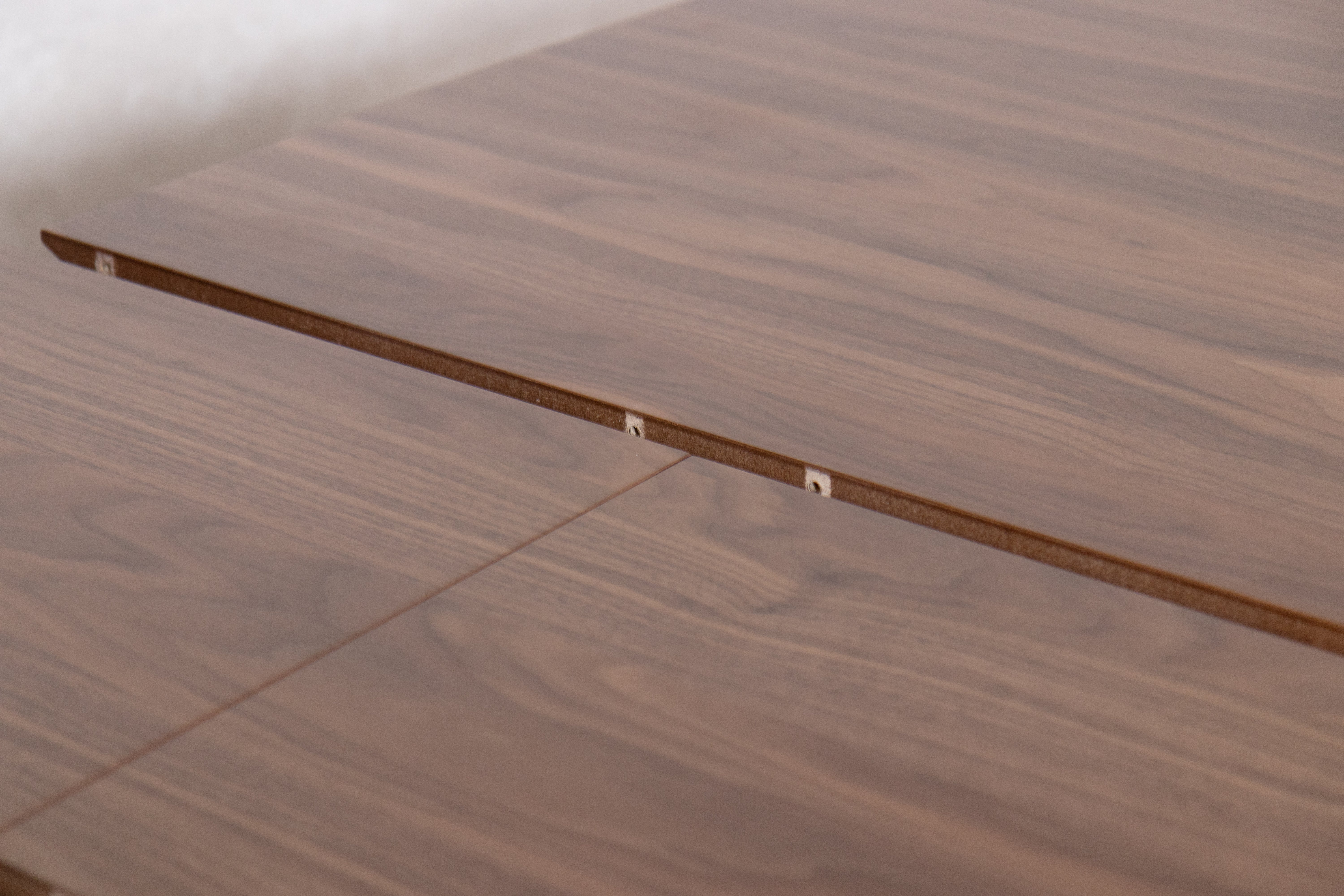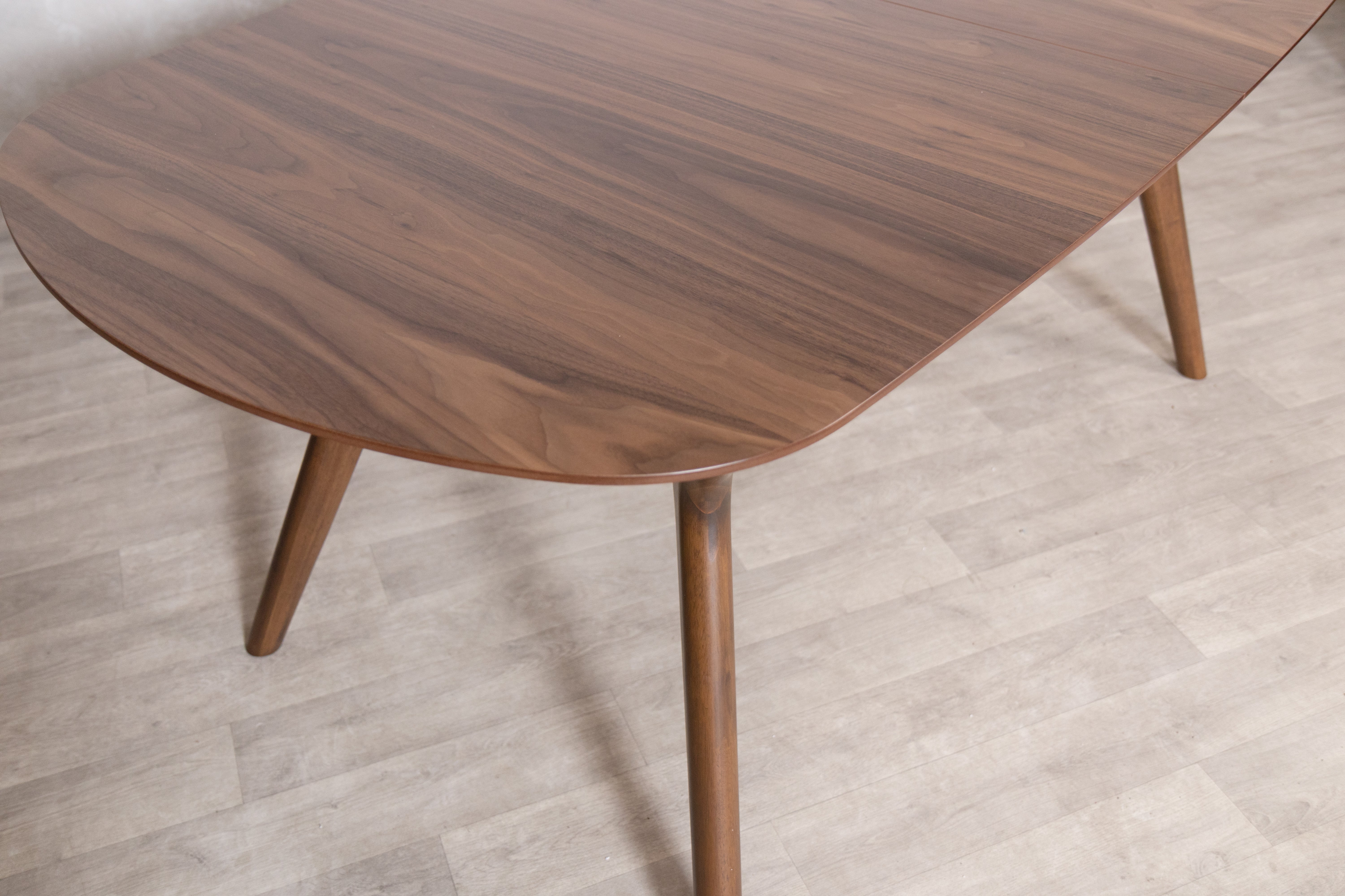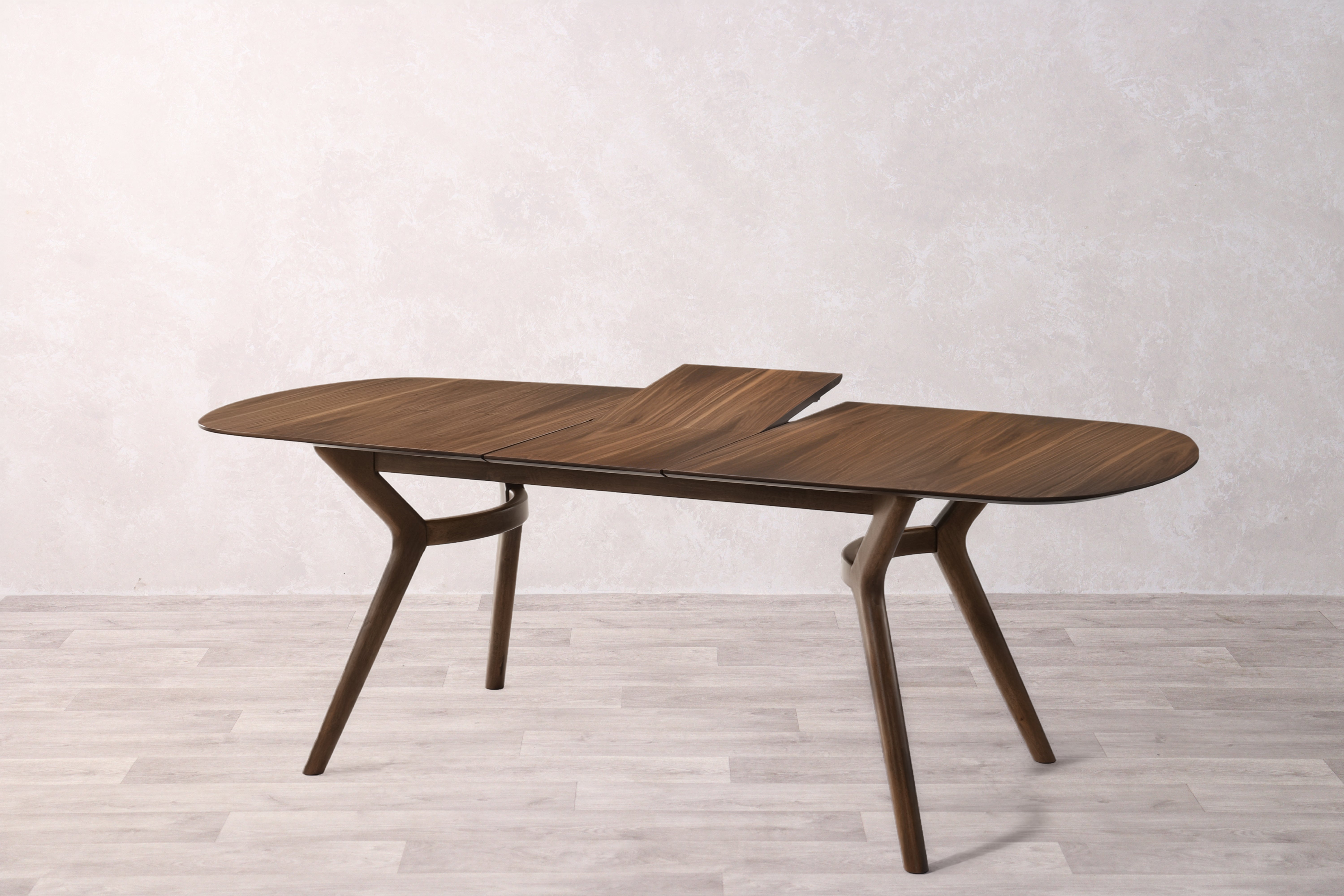 The Layla Oval Extending Table features an innovative central extension system with a smooth ball bearing sliding mechanism that effortlessly adjusts your dining space. Crafted from solid hardwood with a warm walnut finish, this modern table showcases a streamlined oval shape and distinctive Y-shaped legs that provide both stability and visual interest. The extension panel stores neatly within the table structure, maintaining clean lines when not in use, while the continuous walnut grain flows across the entire surface for a cohesive appearance. The Layla allows you to quickly adapt from intimate dinners to larger gatherings, adjusting the table size as your seating requirements change.