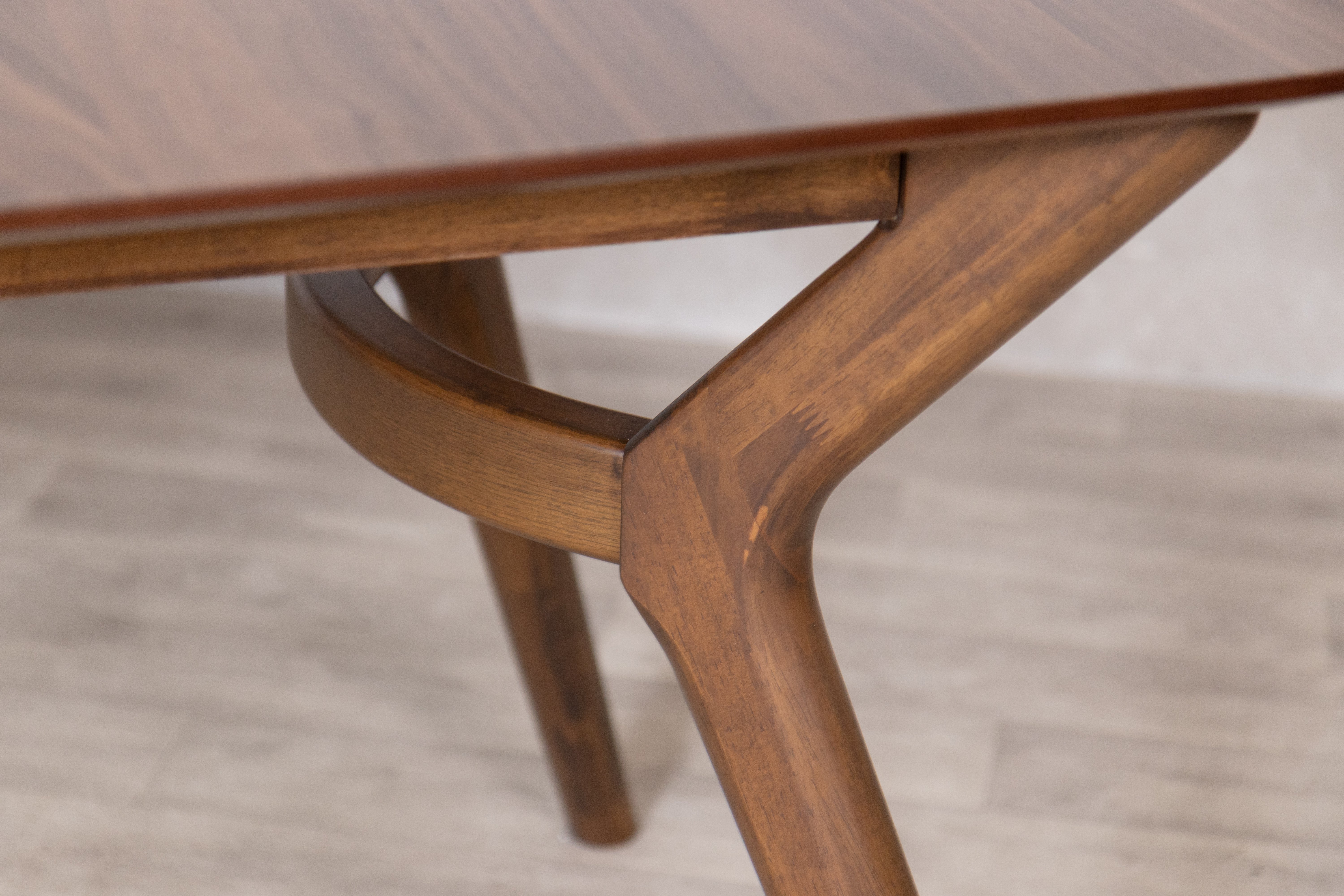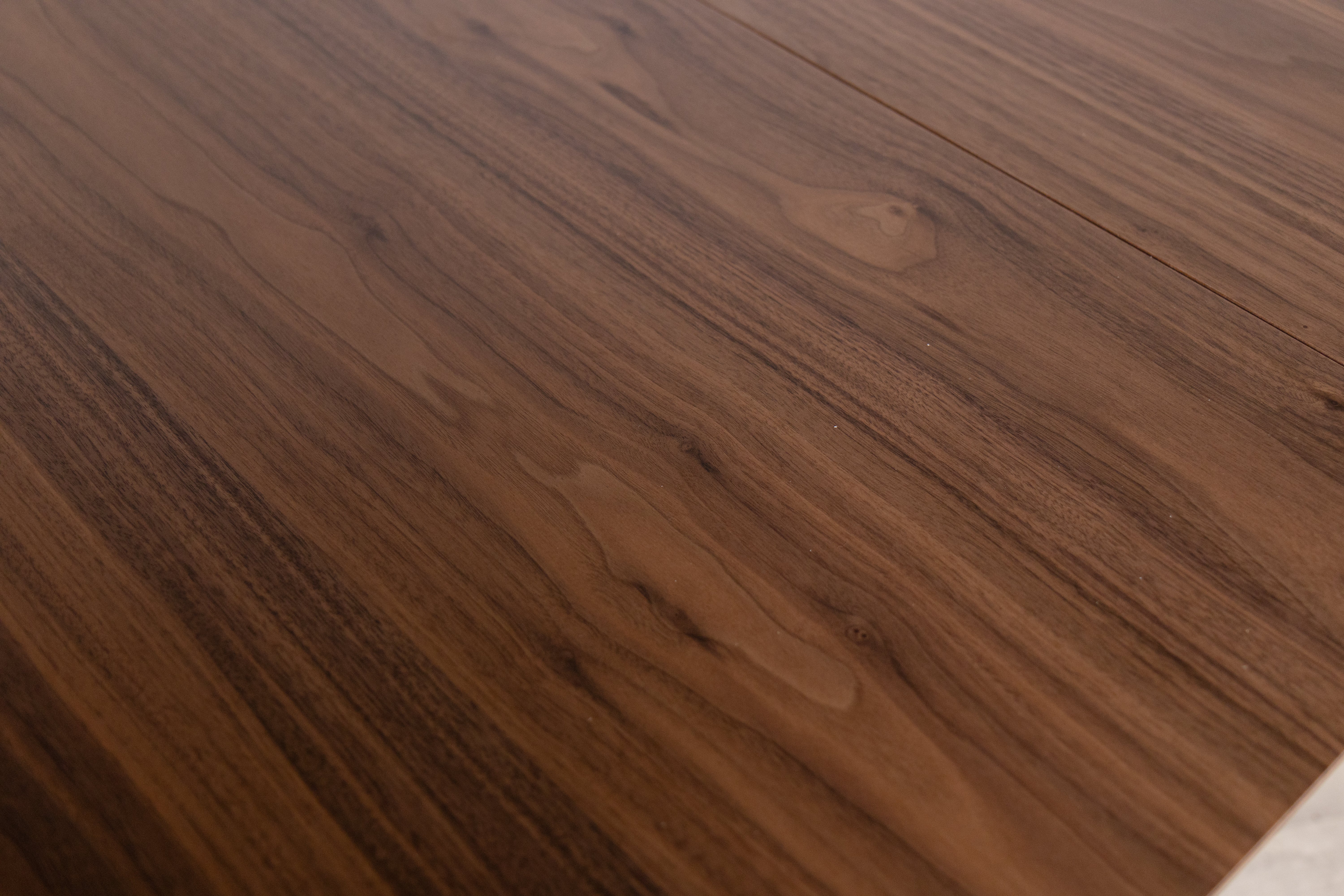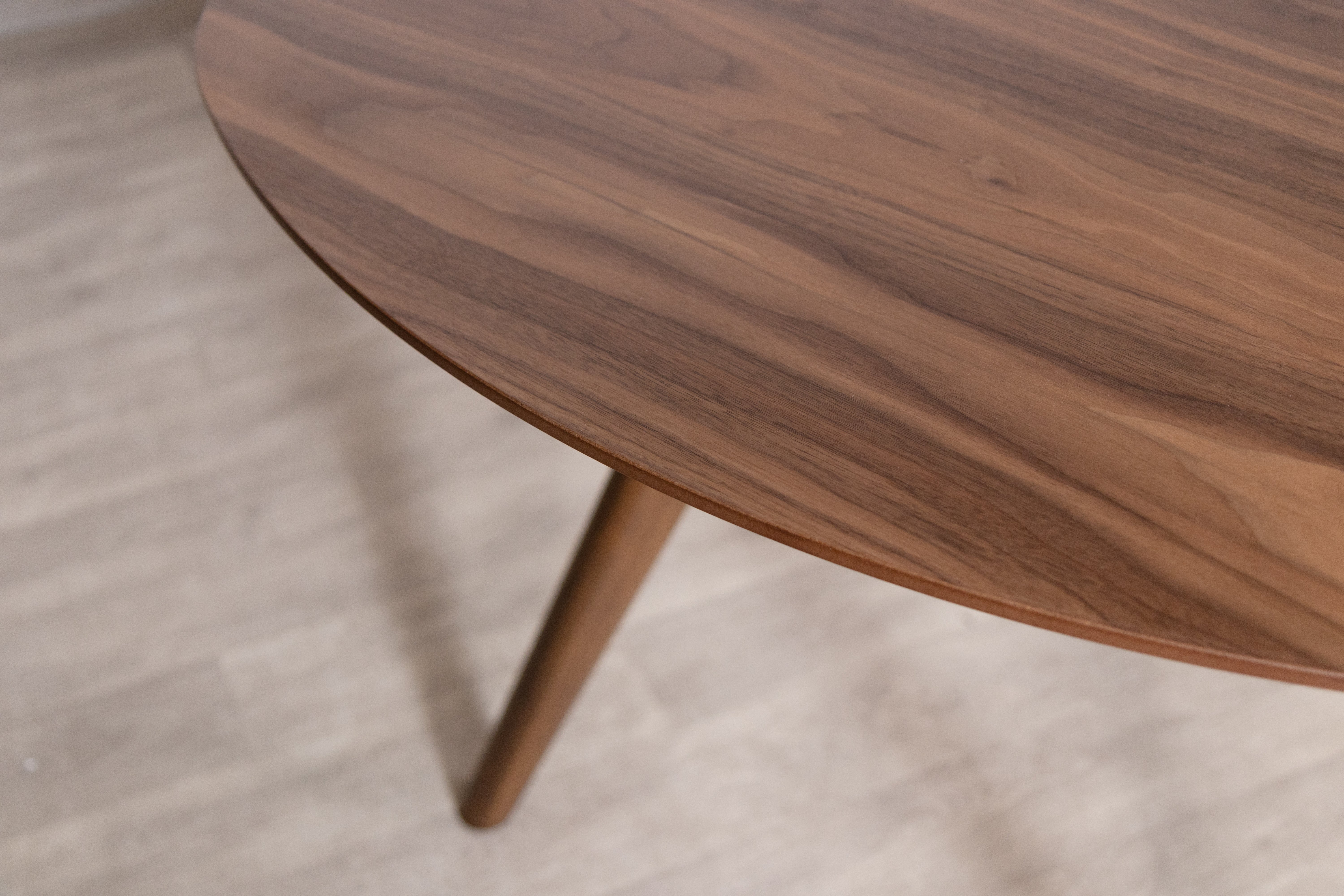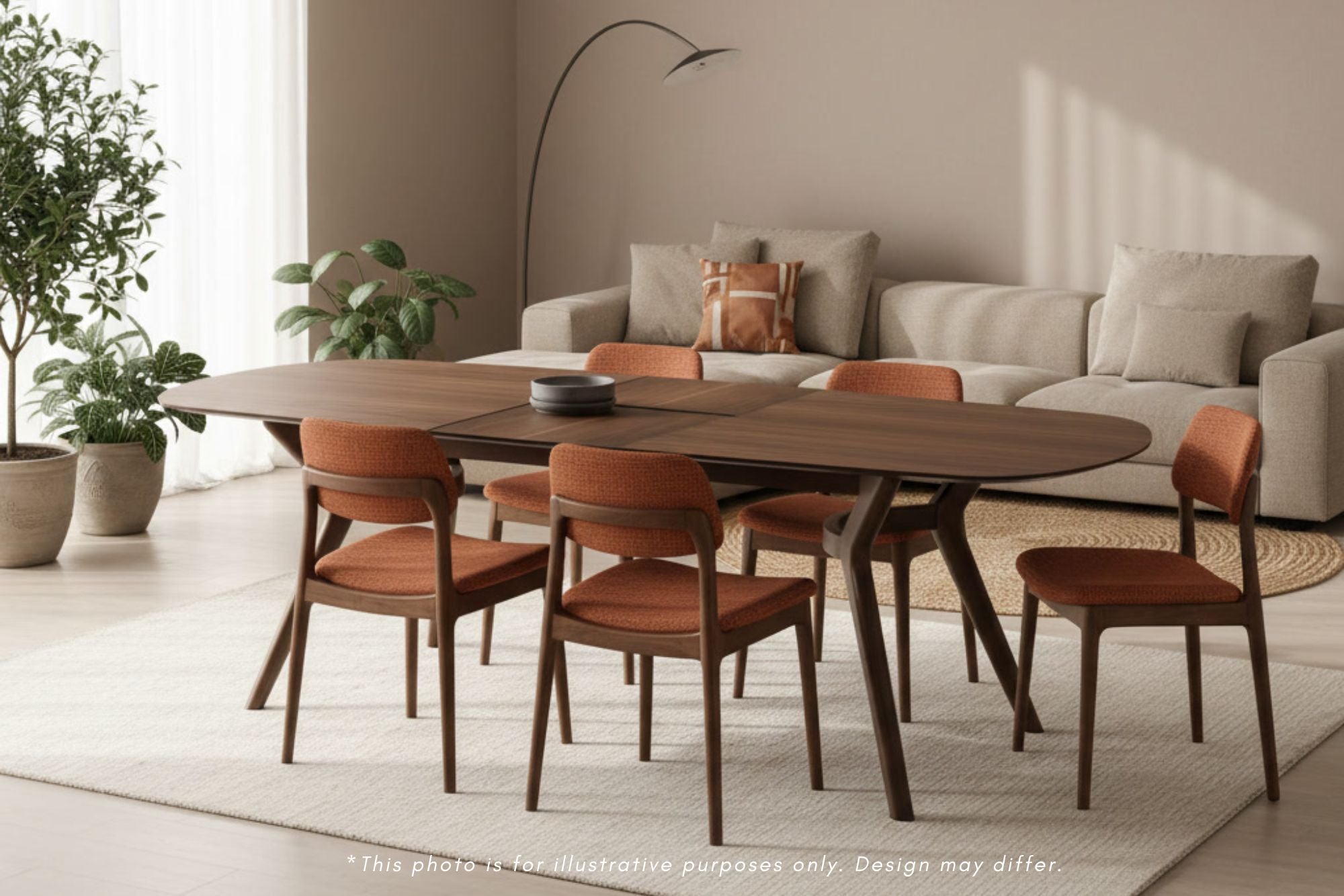 The Layla Oval Extending Table features an innovative central extension system with a smooth ball bearing sliding mechanism that effortlessly adjusts your dining space. Crafted from solid hardwood with a warm walnut finish, this modern table showcases a streamlined oval shape and distinctive Y-shaped legs that provide both stability and visual interest. The extension panel stores neatly within the table structure, maintaining clean lines when not in use, while the continuous walnut grain flows across the entire surface for a cohesive appearance. The Layla allows you to quickly adapt from intimate dinners to larger gatherings, adjusting the table size as your seating requirements change.