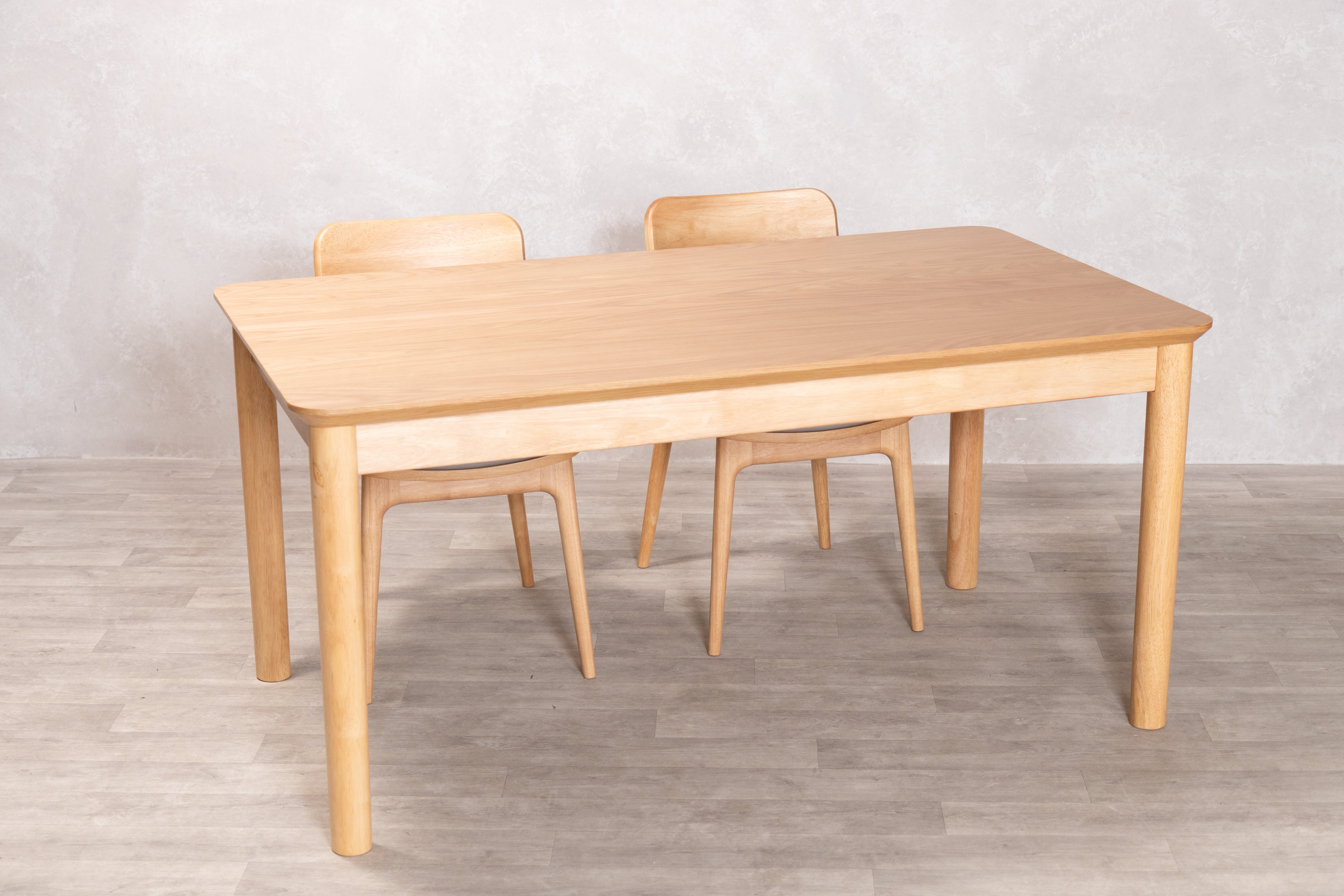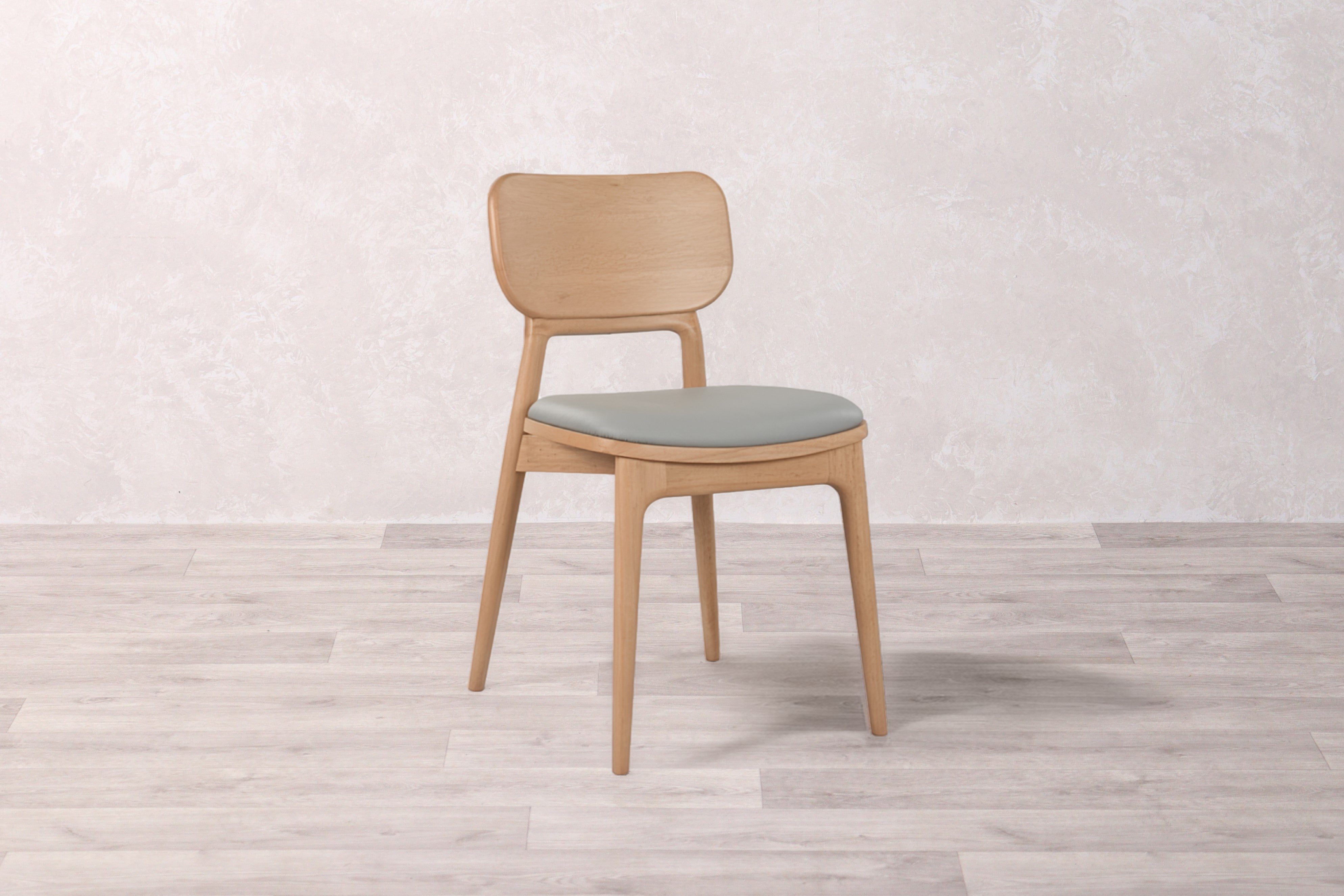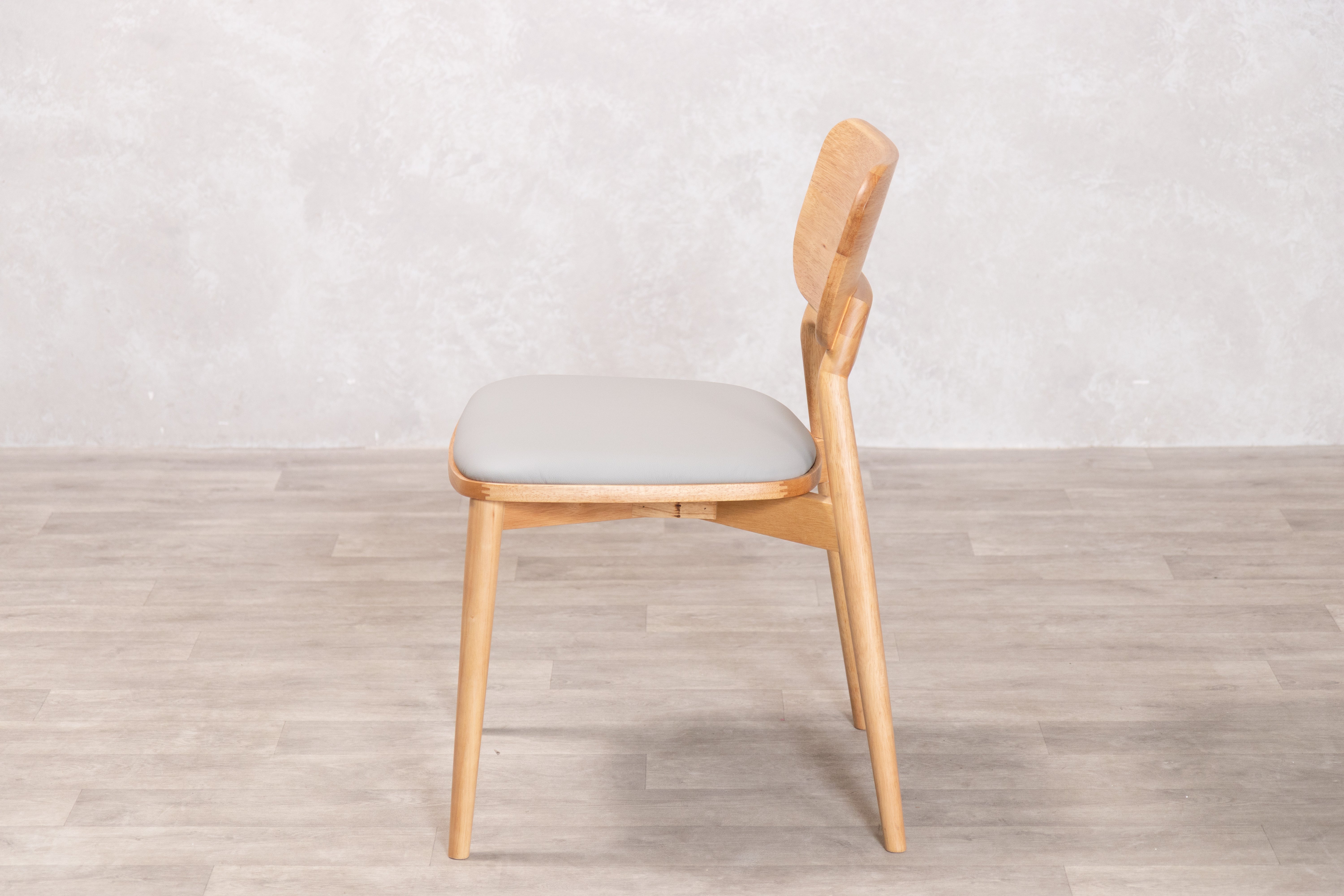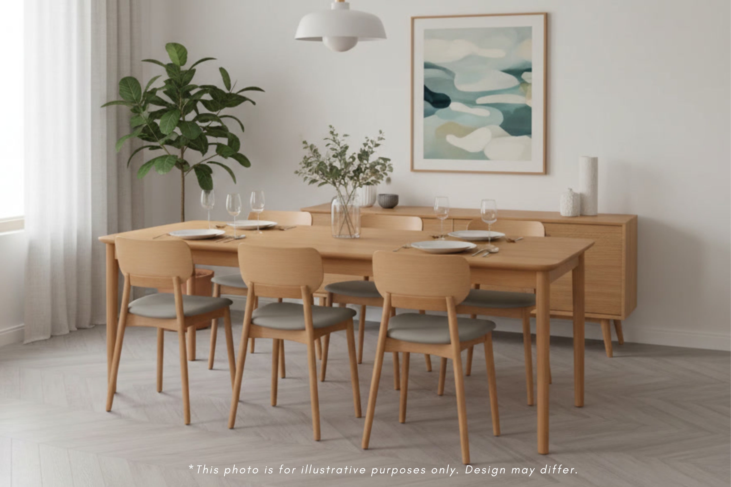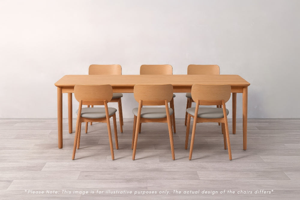 The Louisa Dining Set brings a warm and inviting feel to your dining space. This seven-piece set includes a rectangular dining table and six matching chairs, all crafted from hardwood with clean, simple lines that showcase the natural grain of the wood. The table provides generous surface space for dining and entertaining, with a sturdy frame and wooden offering stability and visual lightness. The chairs feature gently curved backrests and full leather upholstered seats that provide comfortable support, contrasting beautifully with the pale timber tone.