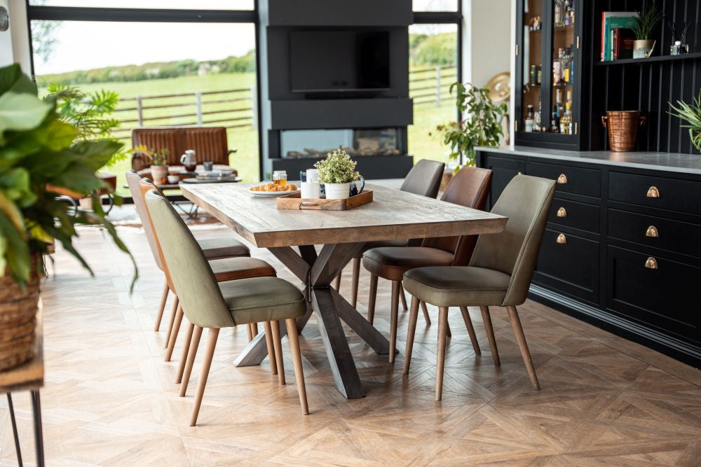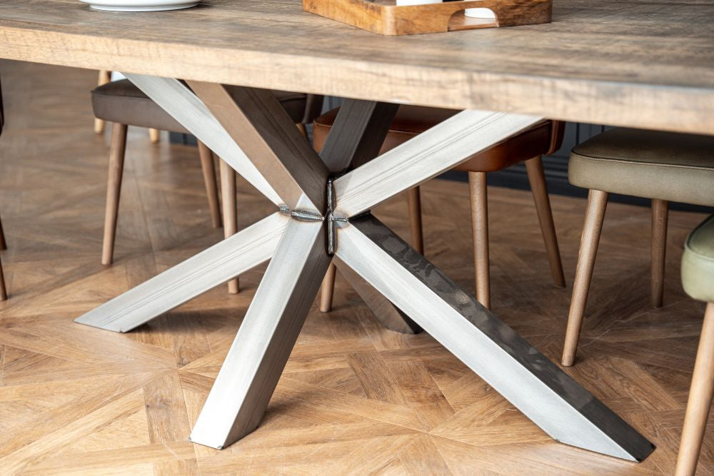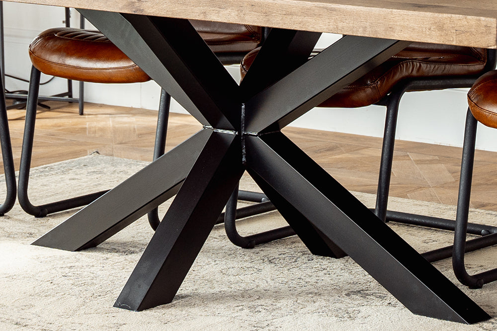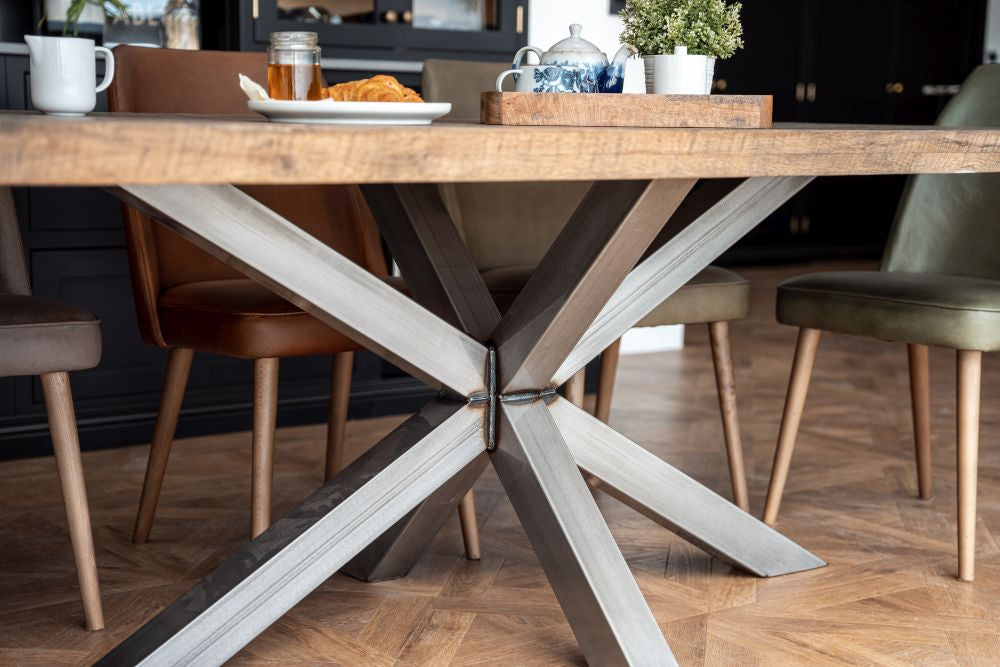 Handcrafted from high-quality timber and metal, this modern oak dining table combines natural materials and industrial style. The Silverback coloured oak dining table top showcases authentic knots and marks, while the unique shaped star base gives this industrial dining table a contemporary edge.