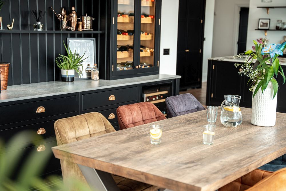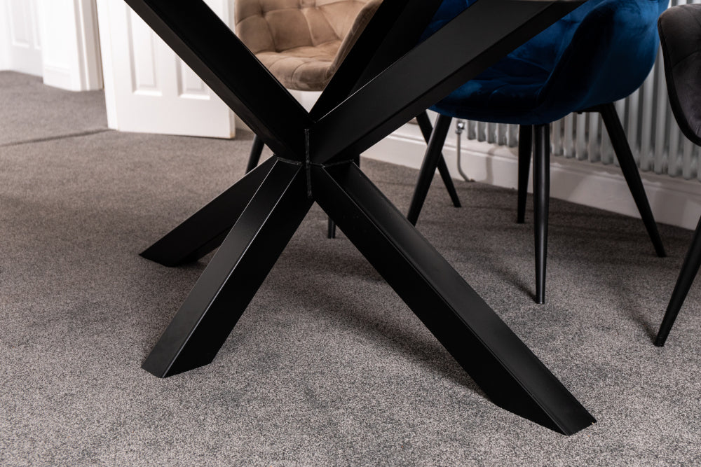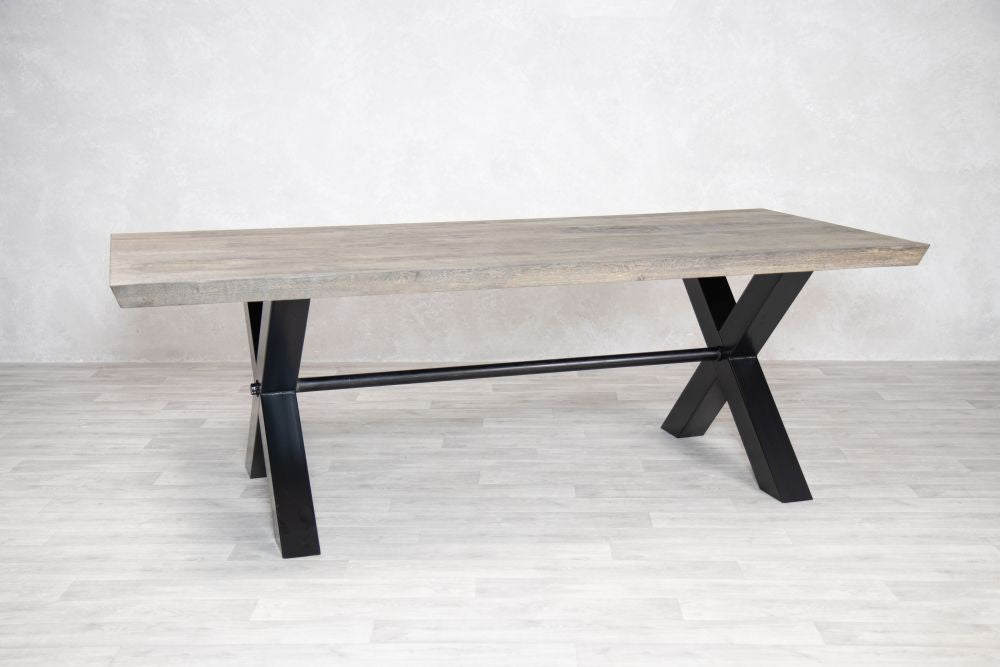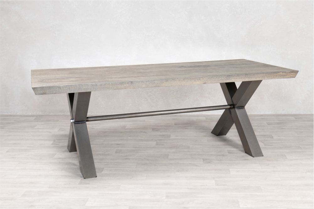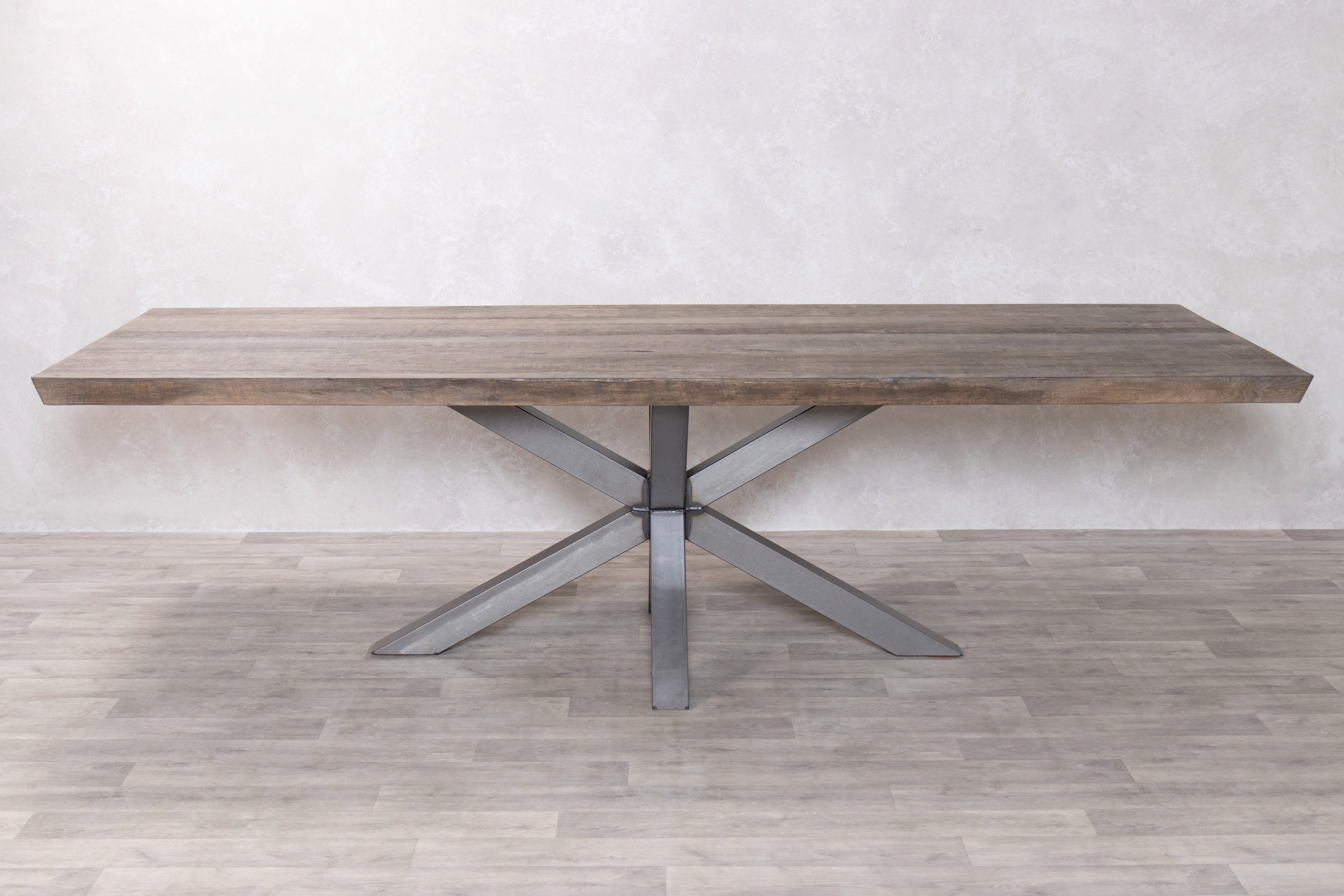 Handcrafted from high-quality timber and metal, this modern oak dining table combines natural materials and industrial style. The Silverback coloured oak dining table top showcases authentic knots and marks, while the unique shaped star base gives this industrial dining table a contemporary edge.
