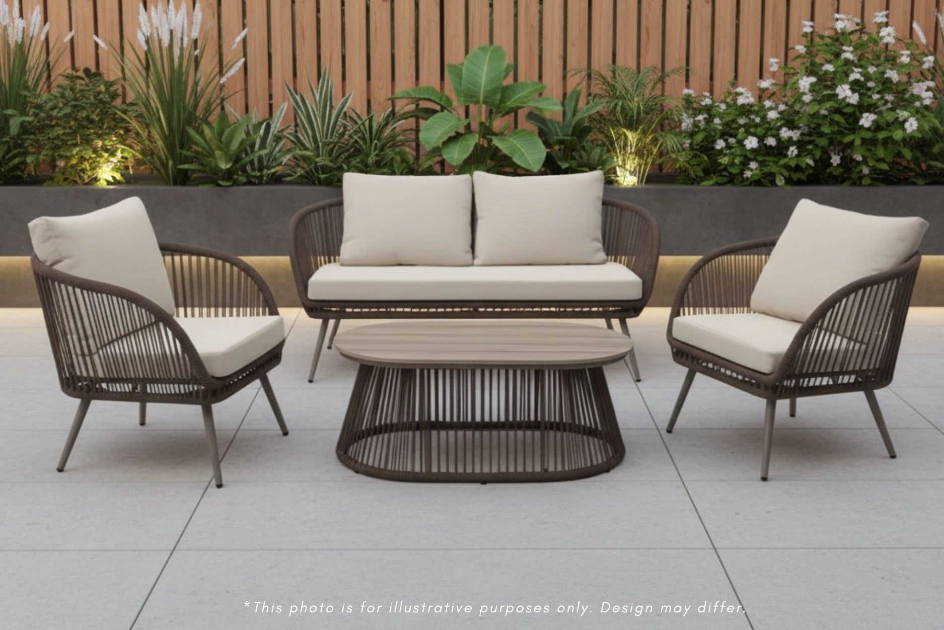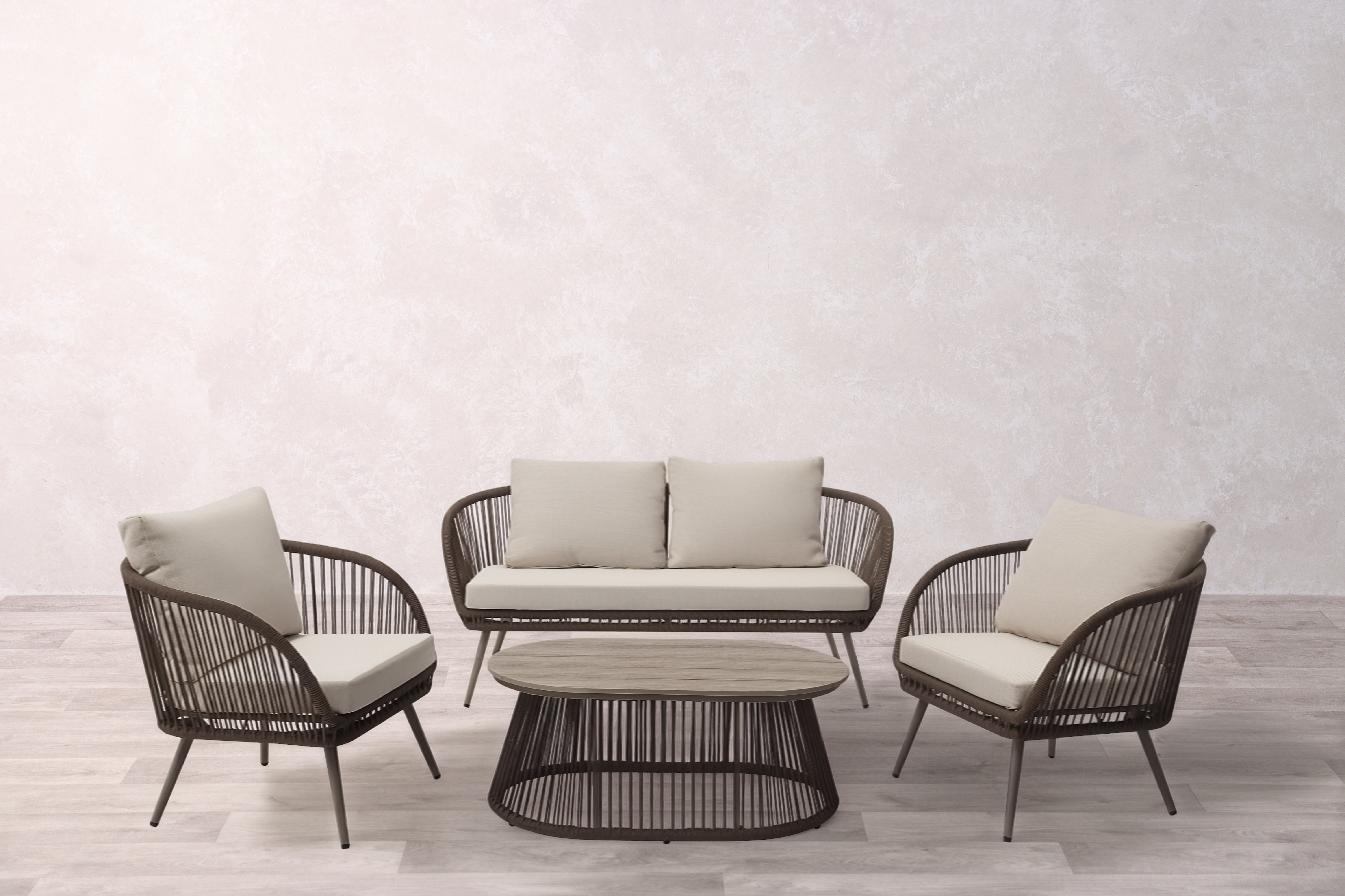 The Bali Outdoor Sofa Set creates a luxurious outdoor living space with its comprehensive arrangement that includes a two-seater love seat, an oval coffee table, and two individual chairs. Each piece features rope detailing over powder-coated steel frames, delivering both visual appeal and long-lasting durability. The polywood table top requires minimal upkeep while providing a practical surface for drinks, dining, or decorative displays. Built to ensure supreme comfort, this set offers generous seating that encourages relaxation and conversation. The materials withstand varying weather conditions, making this a reliable choice for year-round outdoor enjoyment.