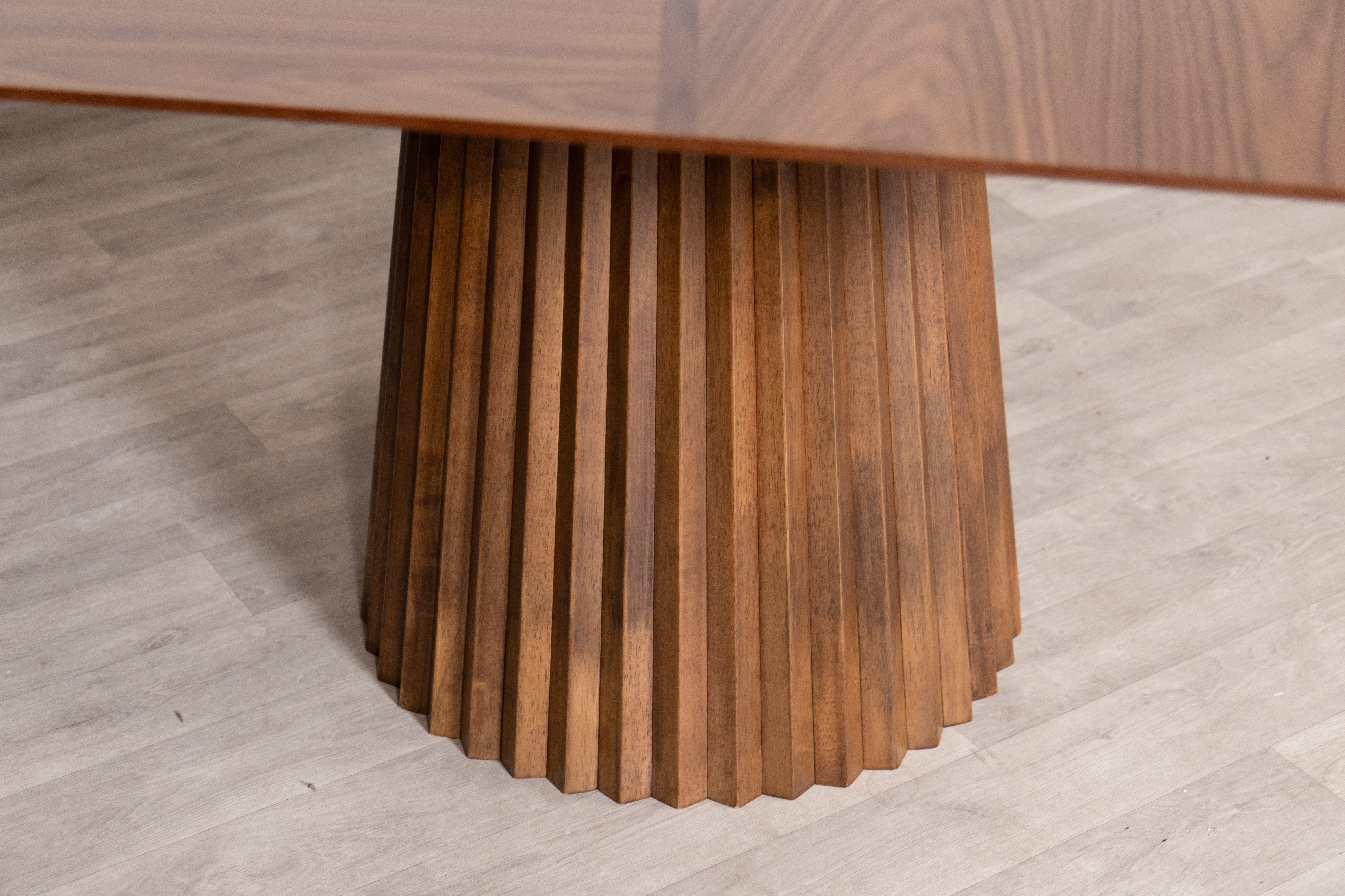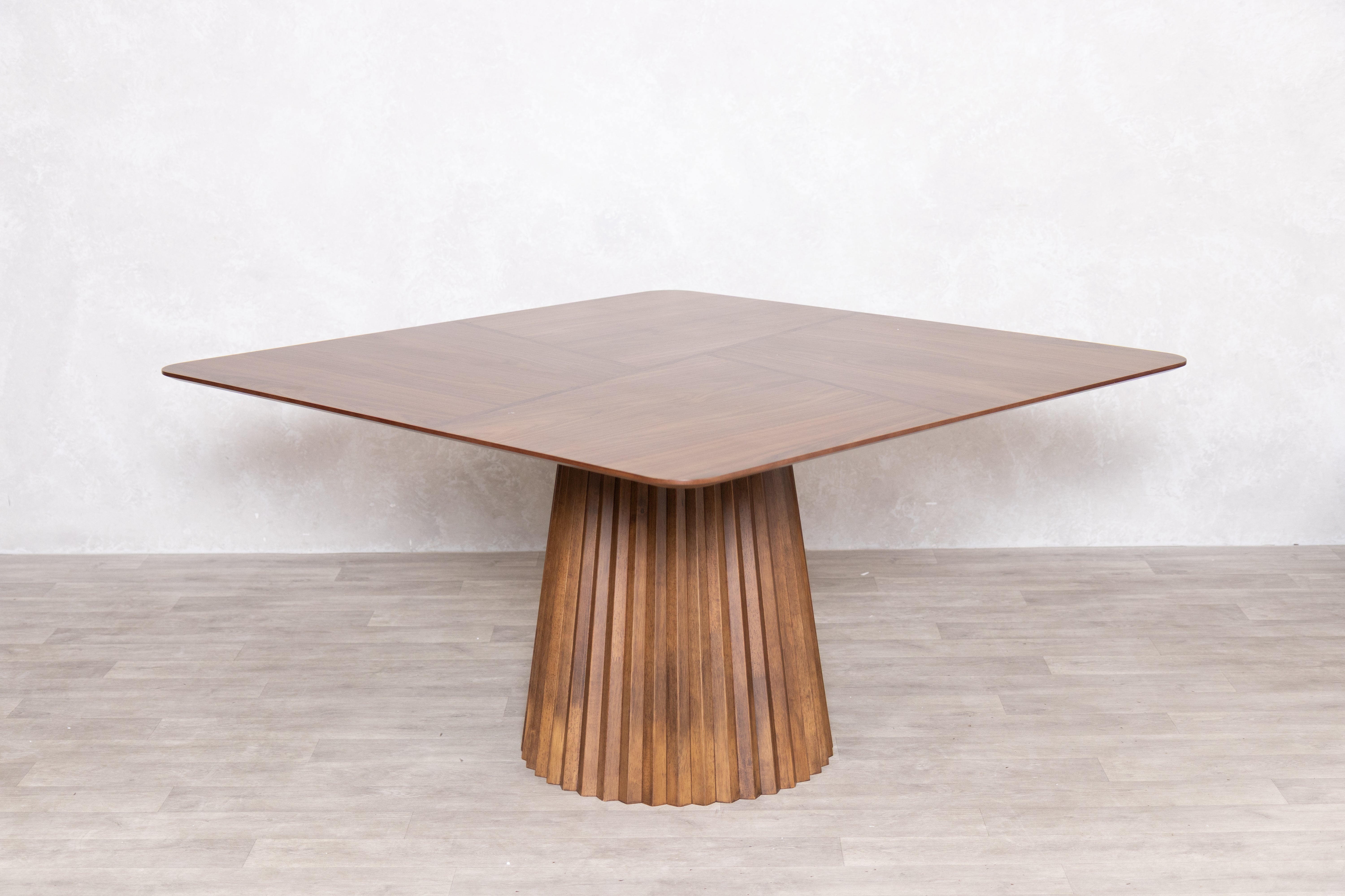 The Layla Dining Set combines the beautifully crafted Square Dining Table with your choice of 8 coordinating Dining Chairs to create a complete dining solution. The table features a distinctive walnut veneer top set upon a solid hardwood sculptural pedestal base, providing ample space to comfortably seat up to 8 people.