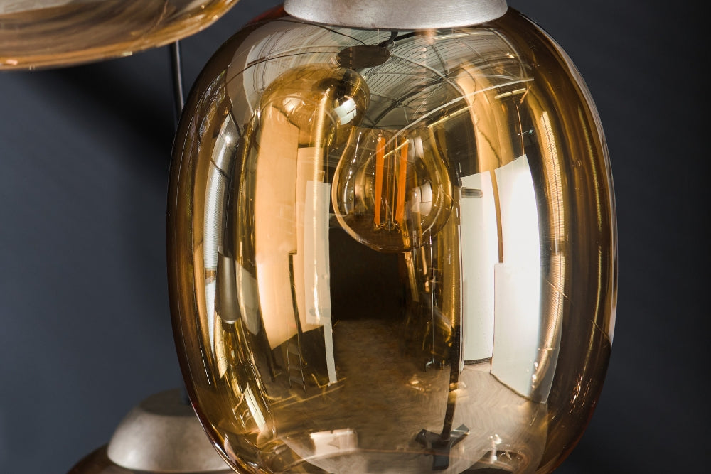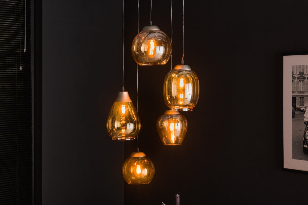 Create a stunning focal point with the Flora 5 String Pendant Light. This contemporary lamp features five elegant amber glass shades, each casting a warm glow. Adjust each shade to your preferred height for a cascading or staggered arrangement. The thoughtfully engineered design ensures all pendants hang perfectly straight while diffusing light beautifully.
